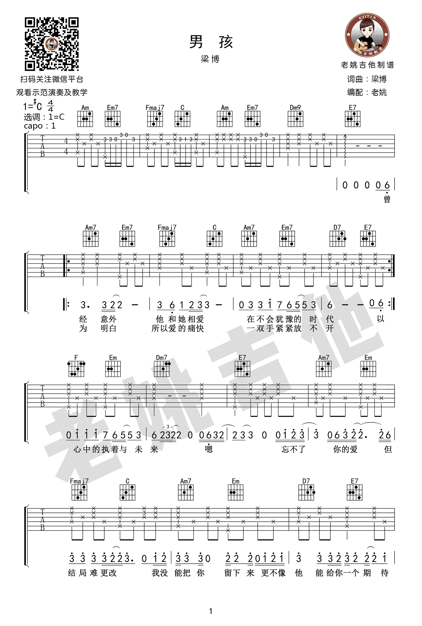 - 男孩吉他谱 梁博 C调弹唱谱 吉他弹唱演示+教学视频