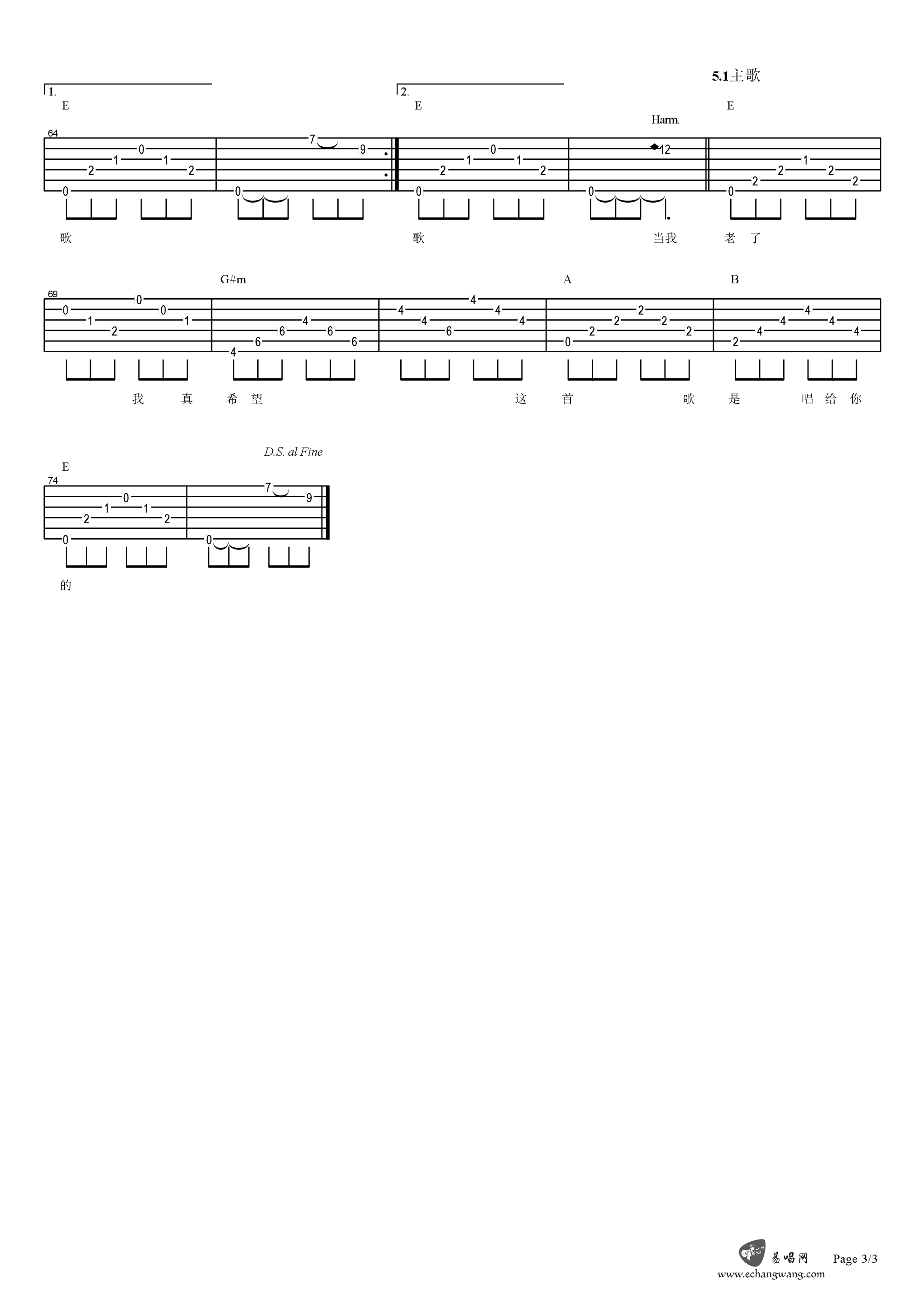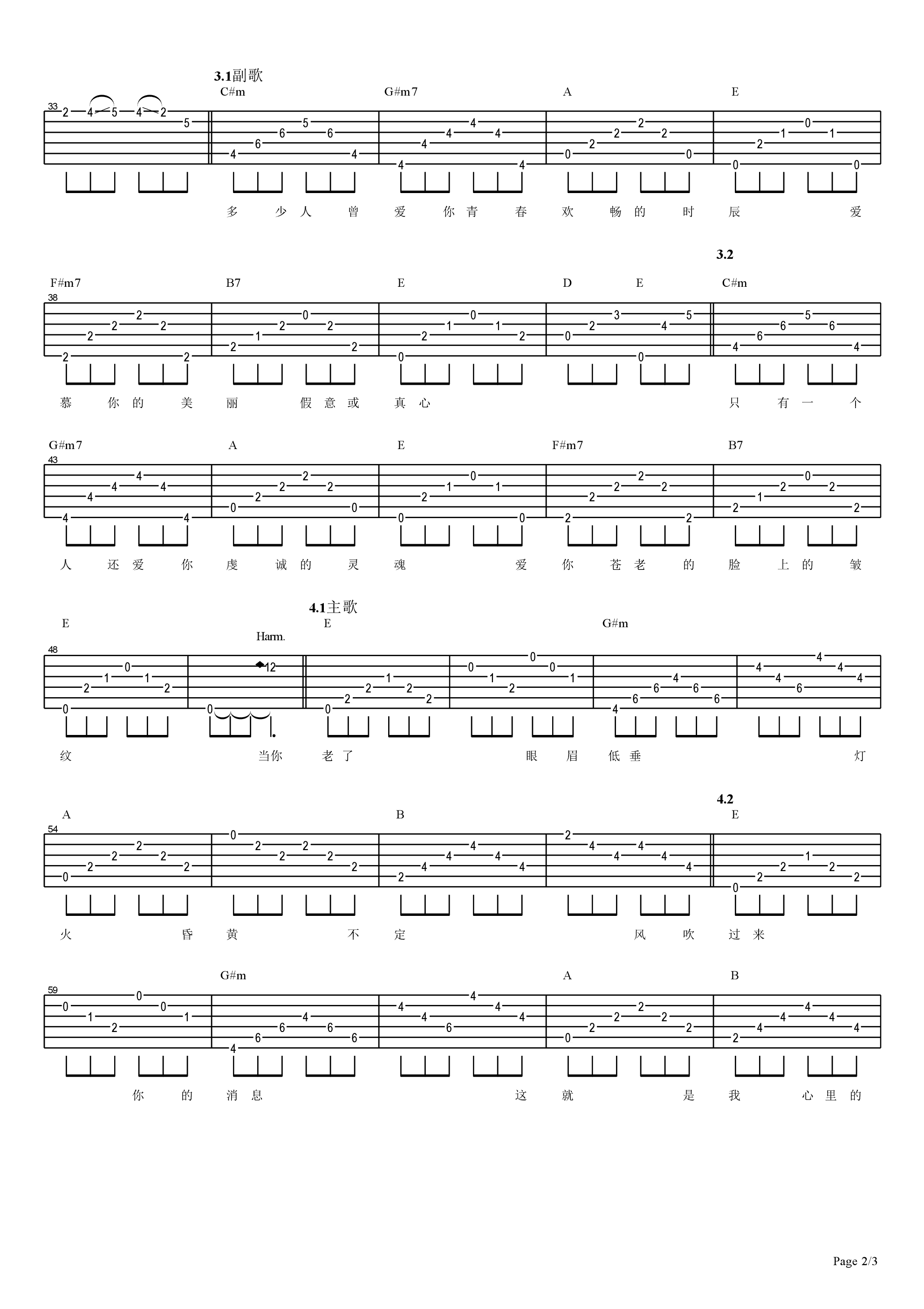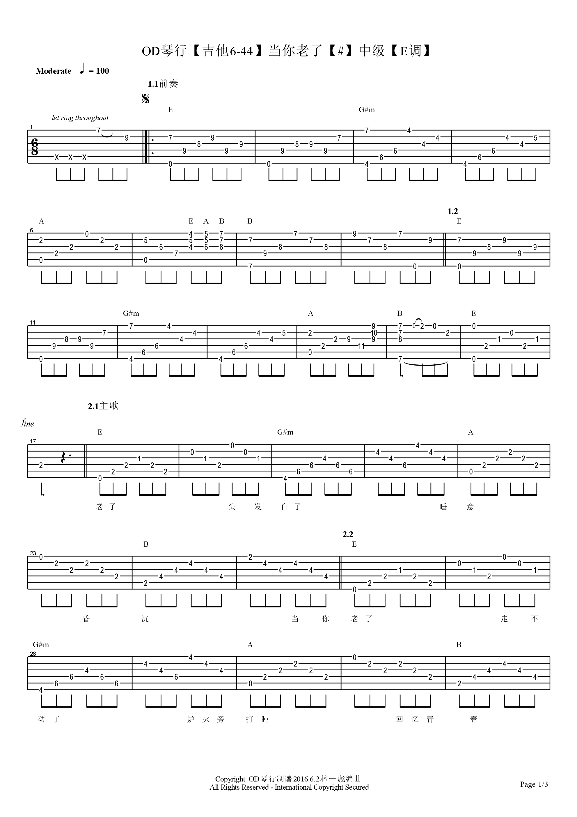 当你老了吉他谱,赵照的一首代表作品,《当你老了》六线谱,选用E调指法,中级版编配,三张高清图片谱,OD琴行林一彪编配,易唱网推荐分享。