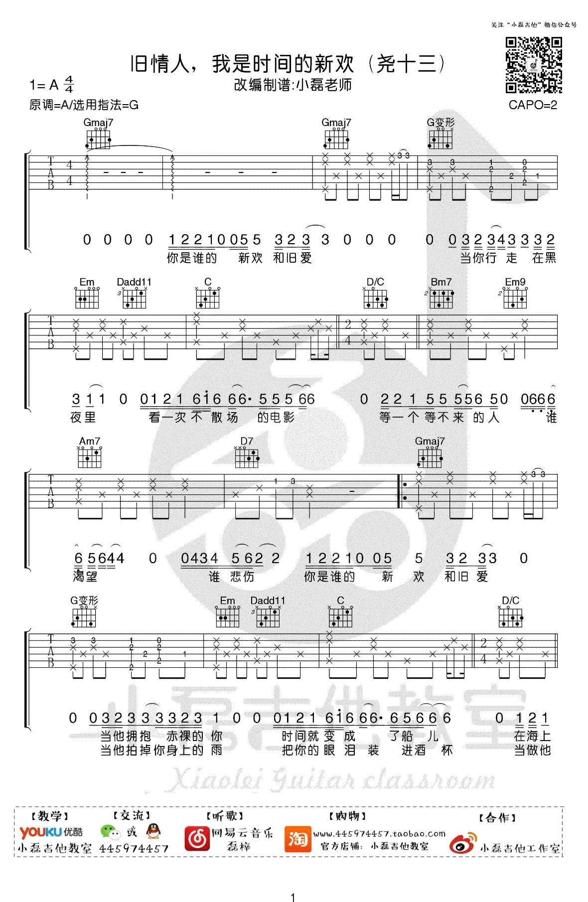 旧情人,我是时间的新欢吉他谱,尧十三演唱,一首深情调民谣歌曲,《旧情人,我是时间的新欢》六线谱,三张图片谱,原调A,选用G调指法,感谢小磊吉他的编配和提供的视频讲解以及弹唱演示,易唱网推荐分享。