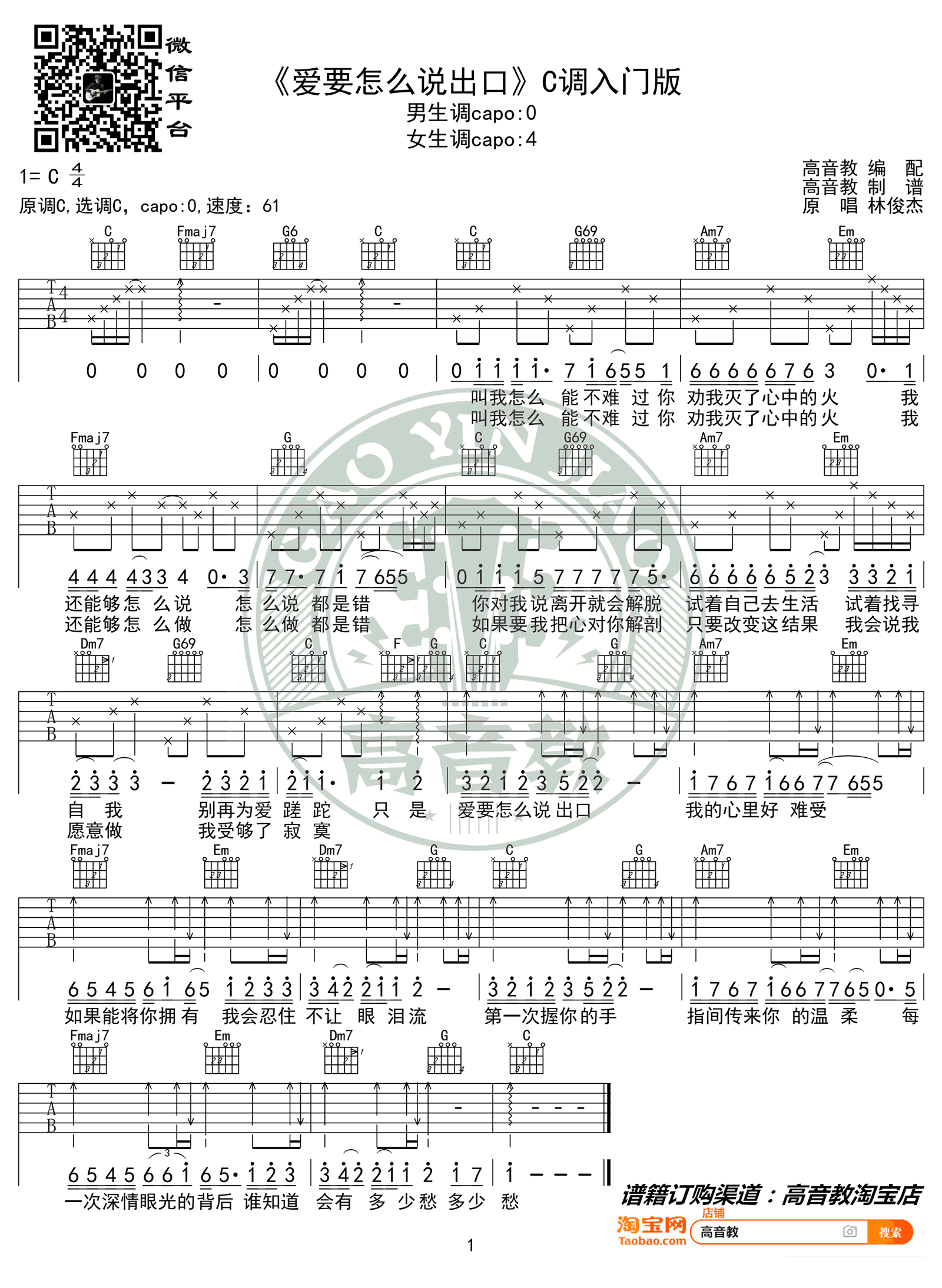 - 爱要怎么说出口吉他谱 林俊杰 C调弹唱谱 高清图片谱