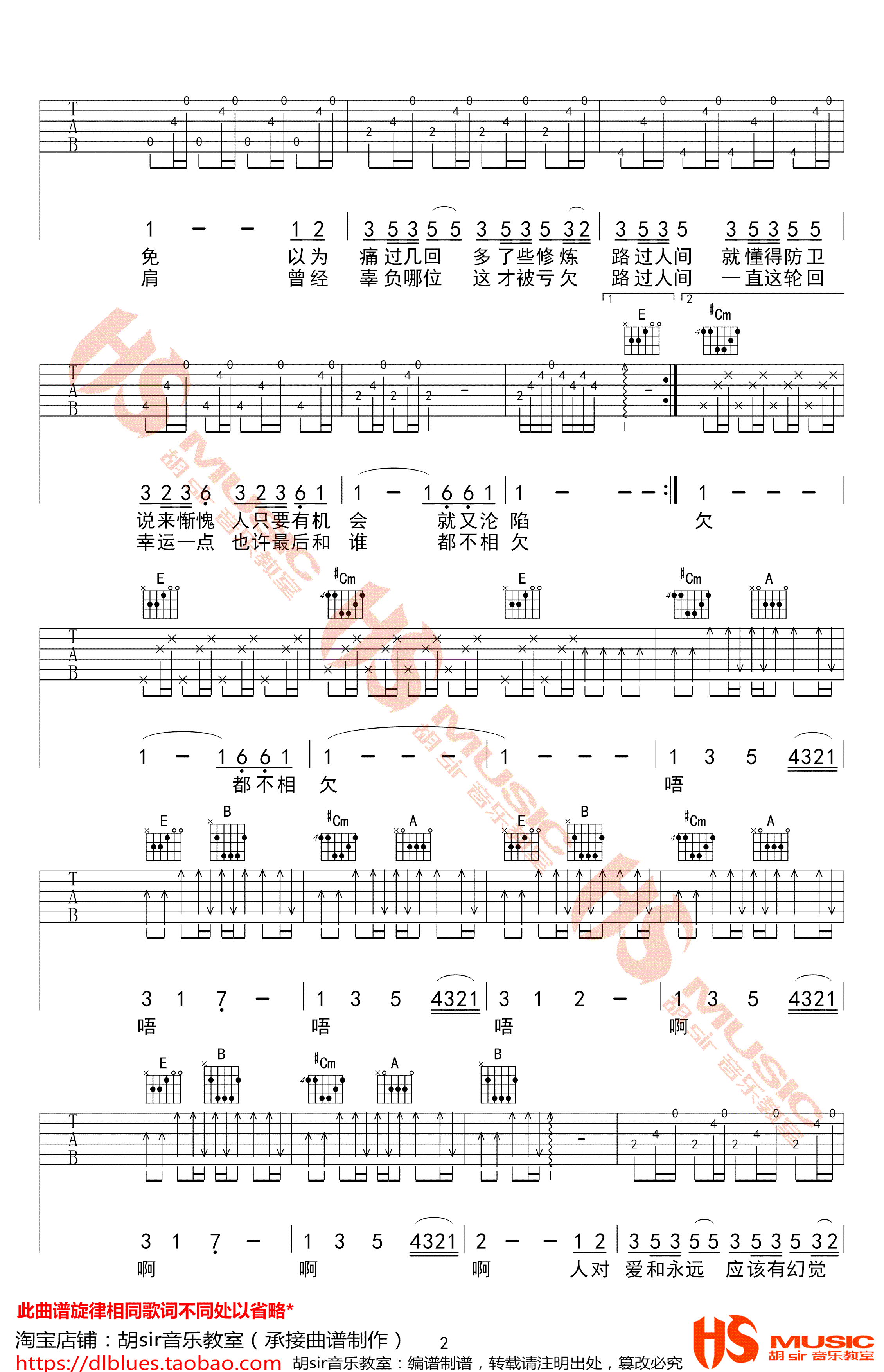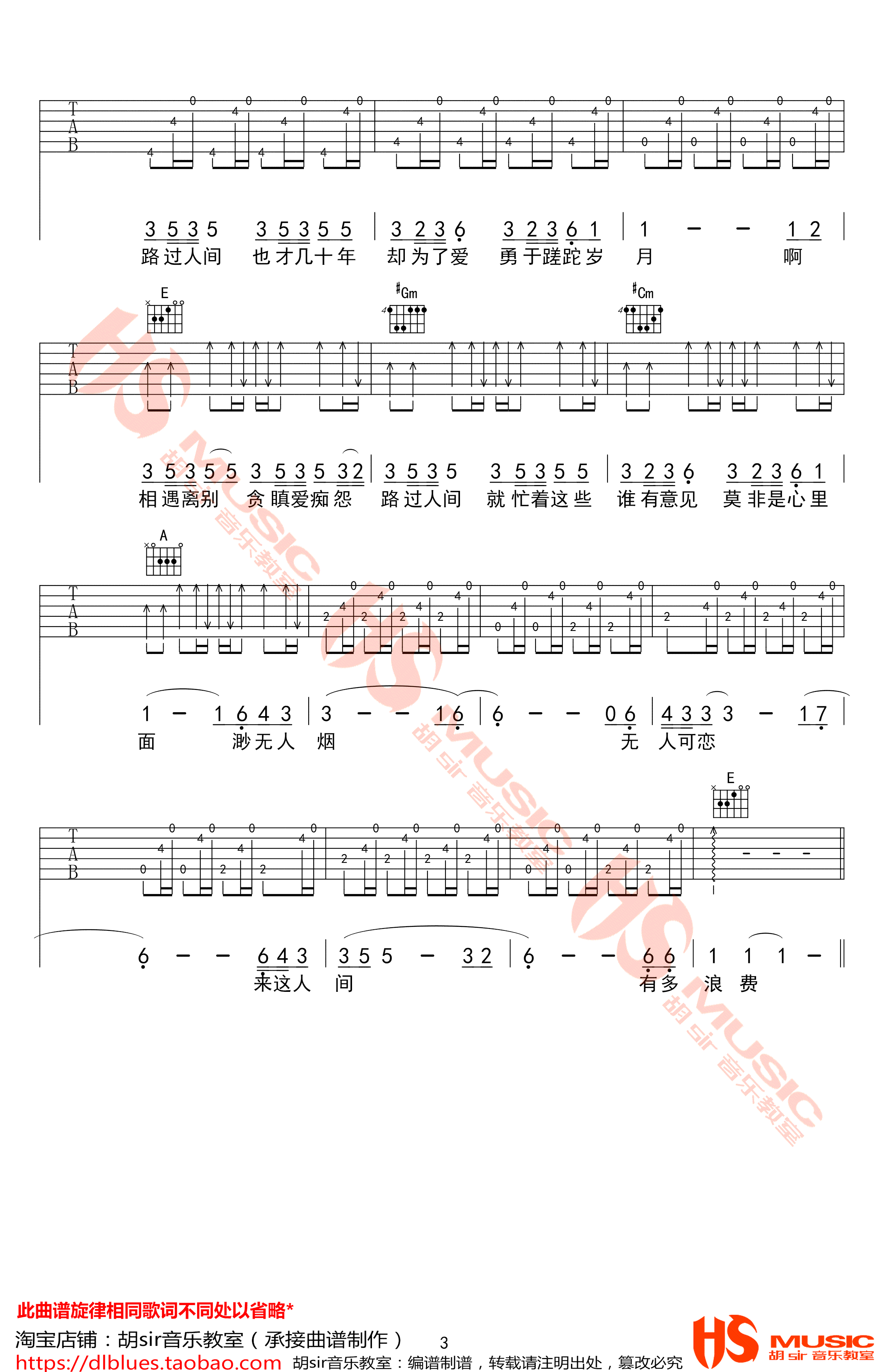 路过人间郁可唯吉他谱 易唱网《路过人间》吉他谱,郁可唯的一首新歌,原调升D,选用E调指法,降半音调弦。路过人间六线谱,三张高清弹唱图片谱。感谢胡sir音乐教室编配,易唱网上传分享。