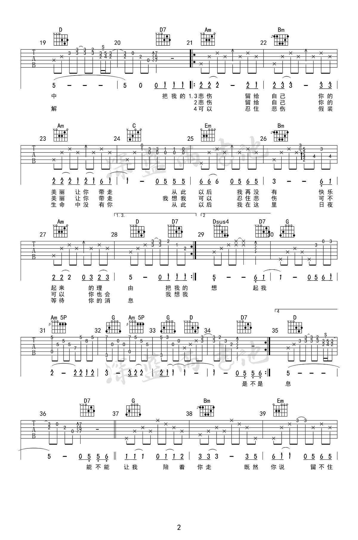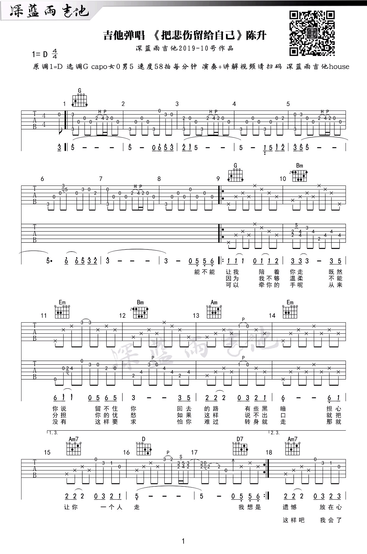 《把悲伤留给自己》吉他谱,陈升创作演唱的一首代表作品。歌曲原调D,采用G调指法编配,男生建议变调夹夹五品。把悲伤留给自己六线谱,三张高清图片谱。深蓝雨吉他出品,易唱网上传。随谱附上吉他弹唱和教学视频,歌曲整体弹唱难度不大,同学们跟随示范讲解学习。一首老歌,像一杯红酒,越久越陈越品越香。歌声低低诉说着的男人心底最深处的悲伤和内心最细腻的情感。