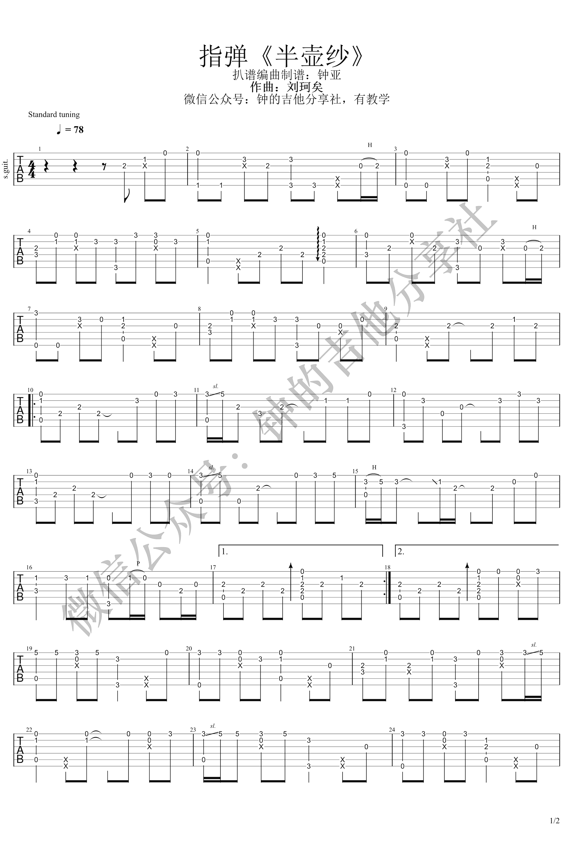 - 月牙湾指弹谱_抖音版_吉他独奏谱_示范视频演示