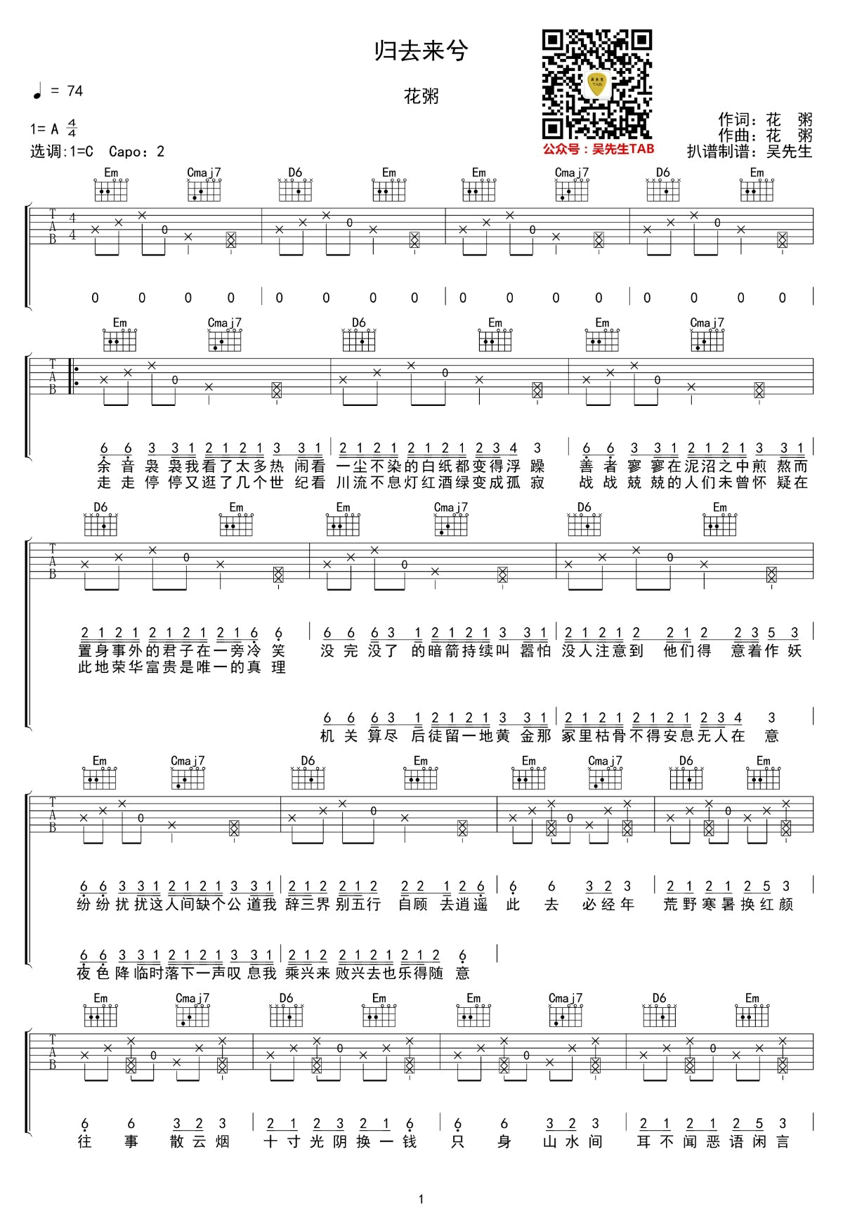 - 归去来兮吉他谱_花粥_G调弹唱谱_图片谱
