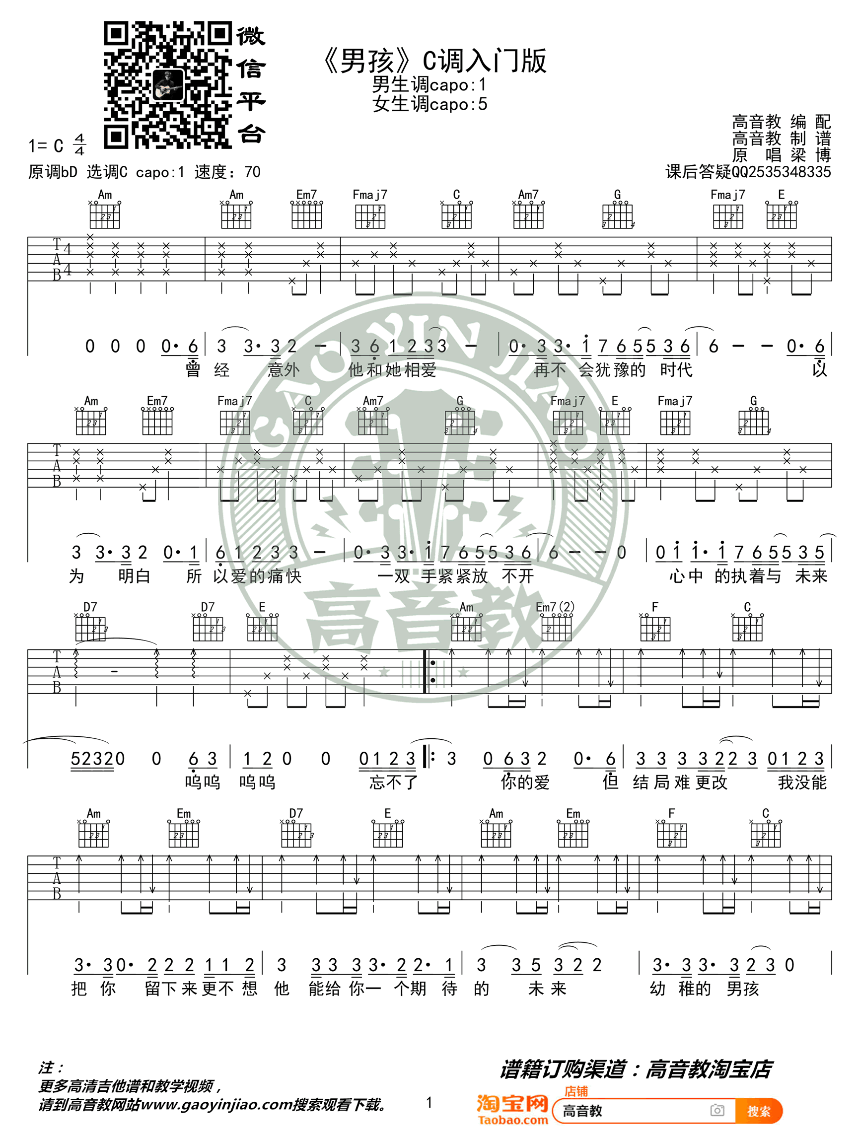 - 梁博男孩吉他谱 C调弹唱谱 高清图片谱