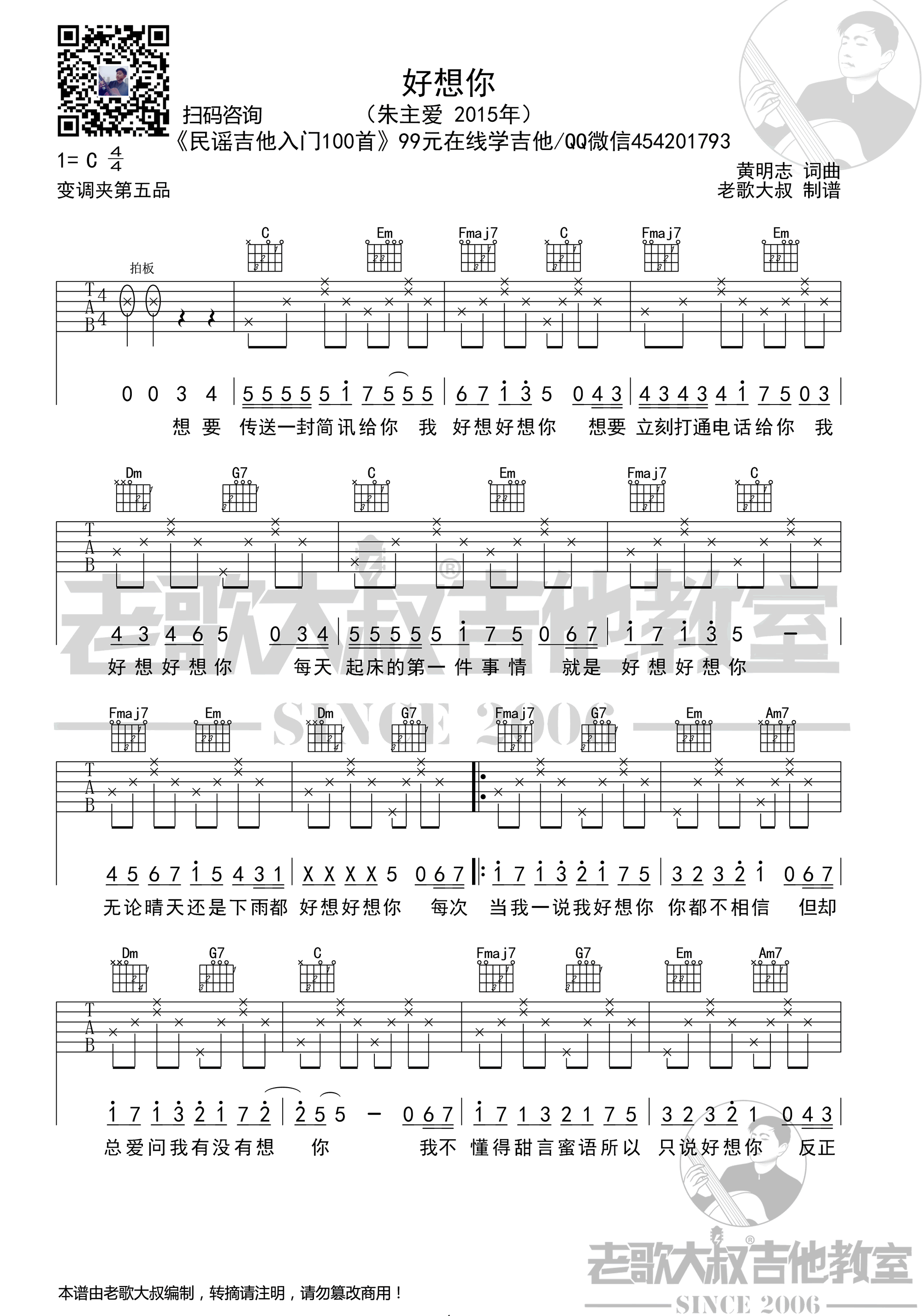 - 朱主爱《好想你》吉他谱_C调六线谱_高清版