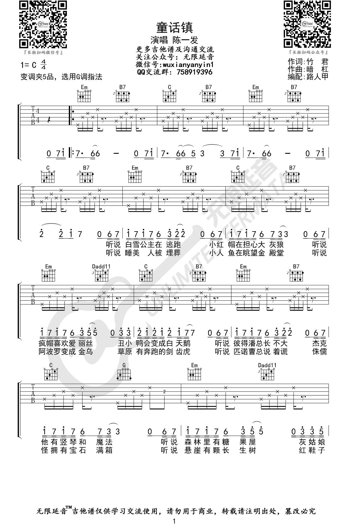 - 童话镇吉他谱_陈一发/暗杠_G调指法_弹唱六线谱