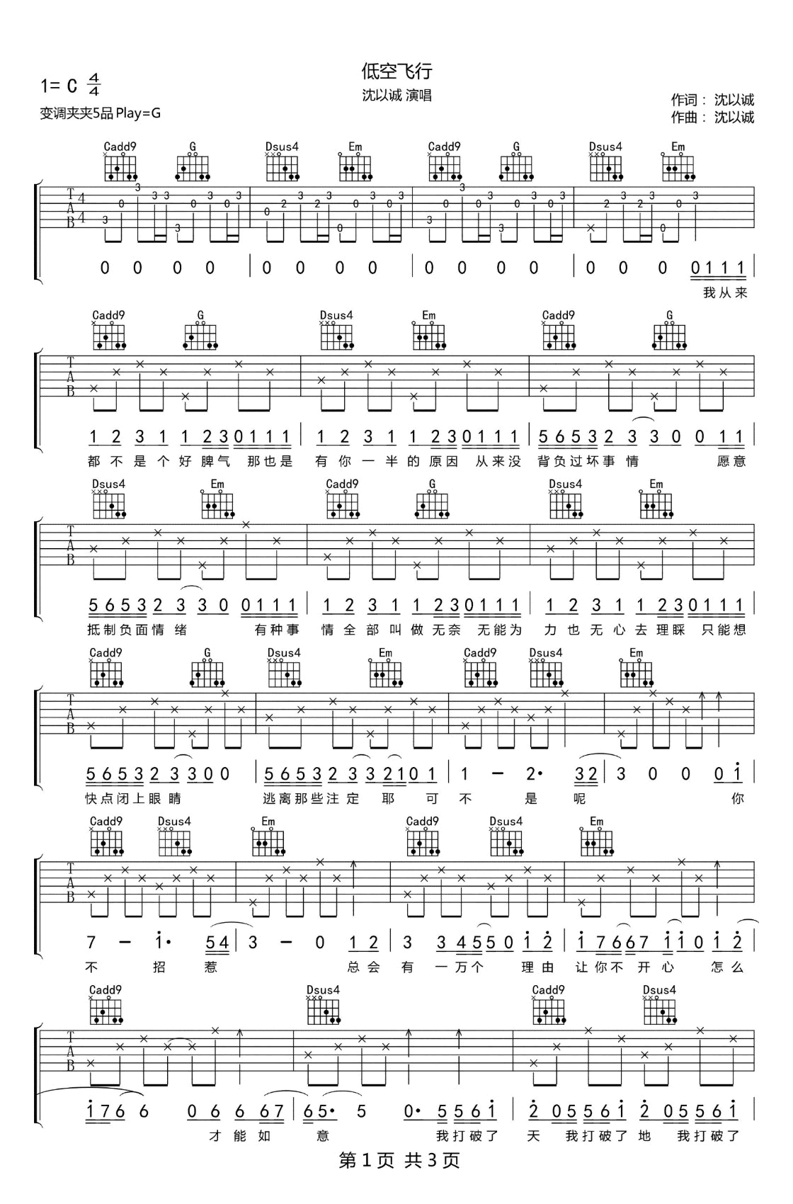 - 低空飞行吉他谱_沈以诚_G调弹唱谱_高清版