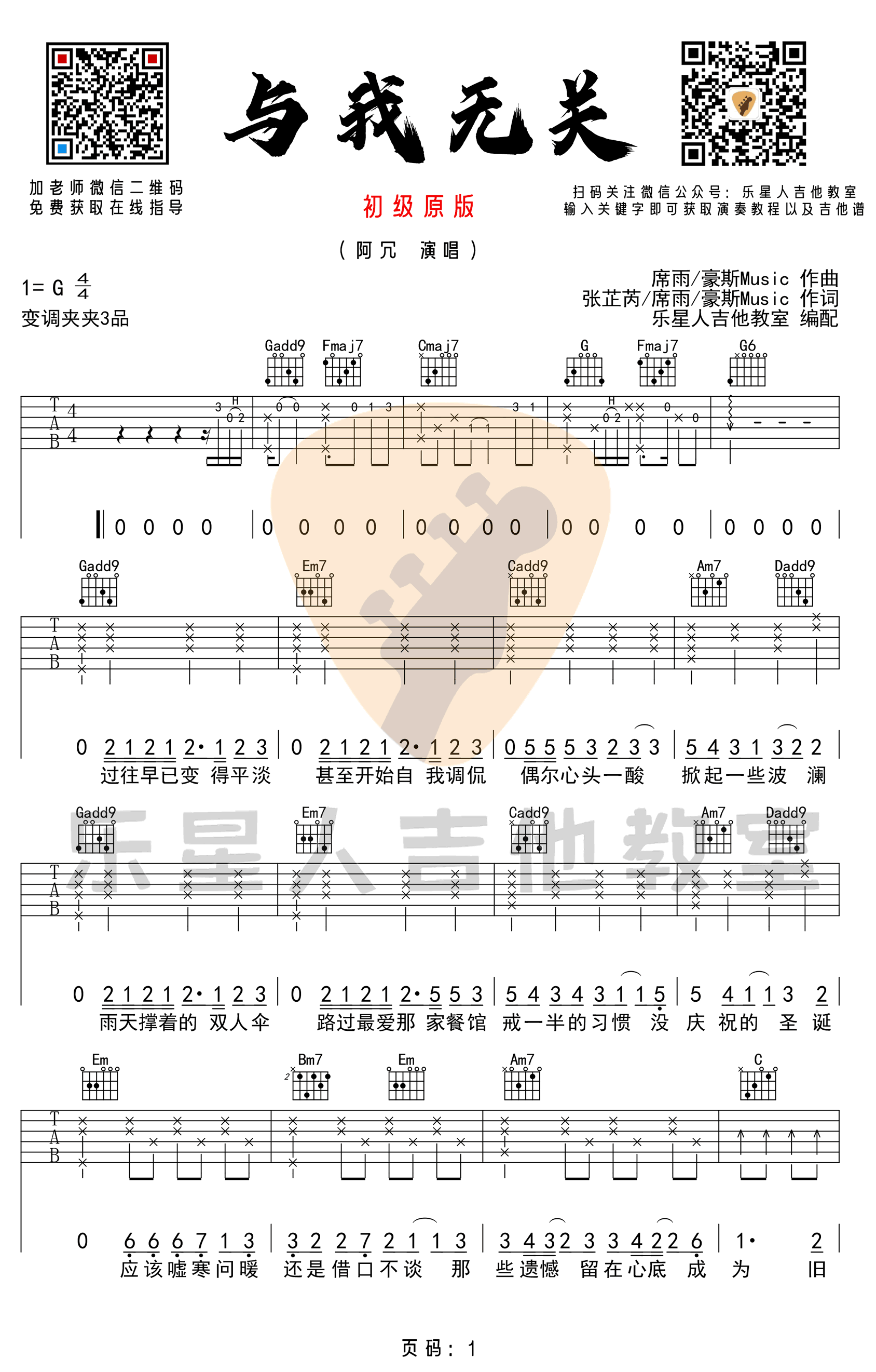- 与我无关吉他谱_阿冗_G调_初级原版_弹唱谱