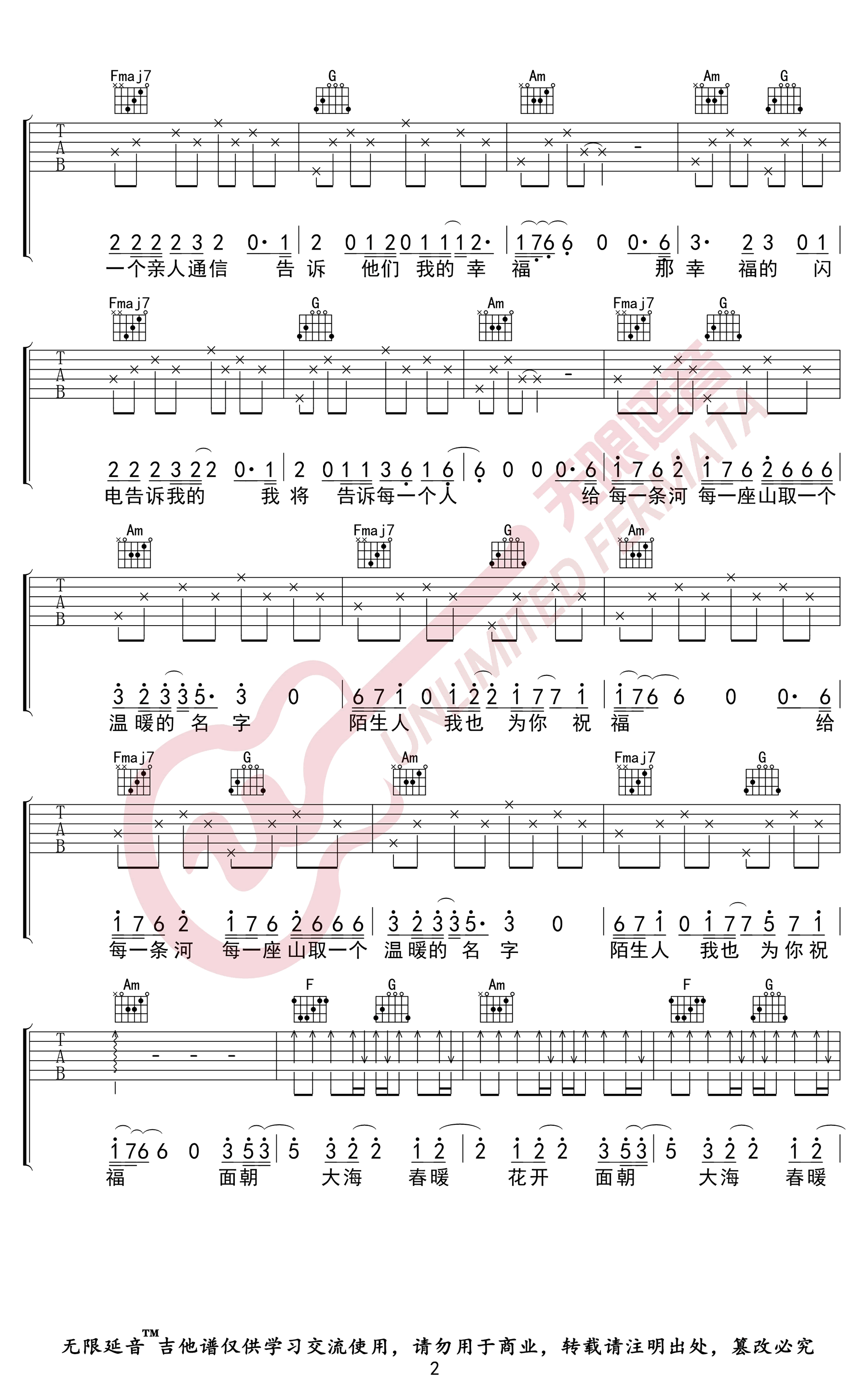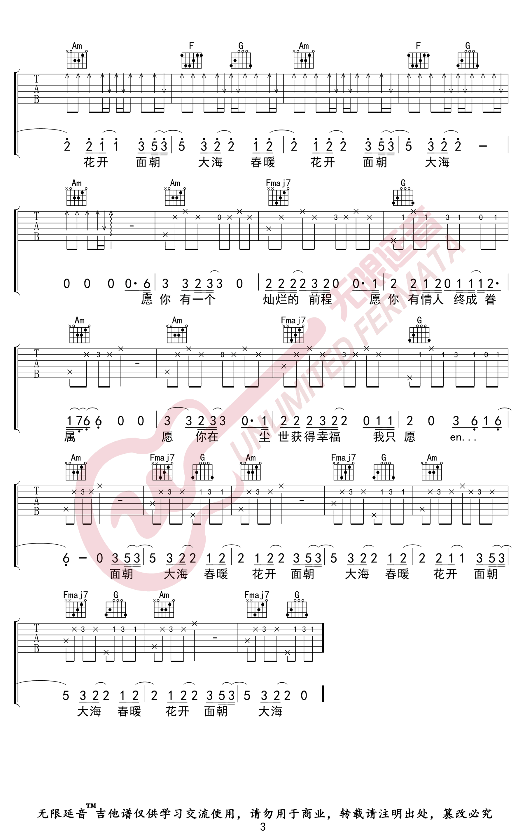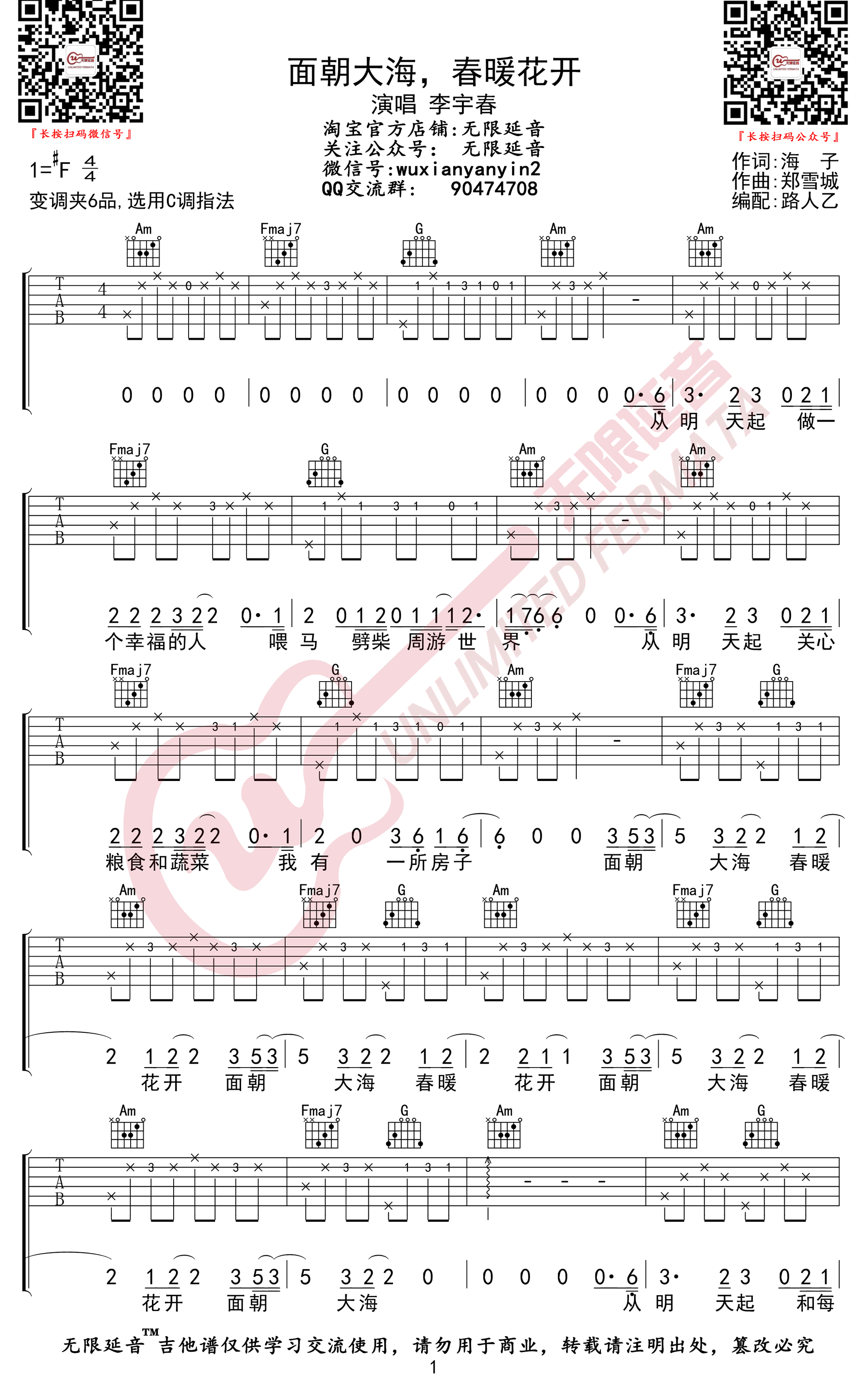 - 面朝大海春暖花开吉他谱_李宇春_C调_弹唱六线谱