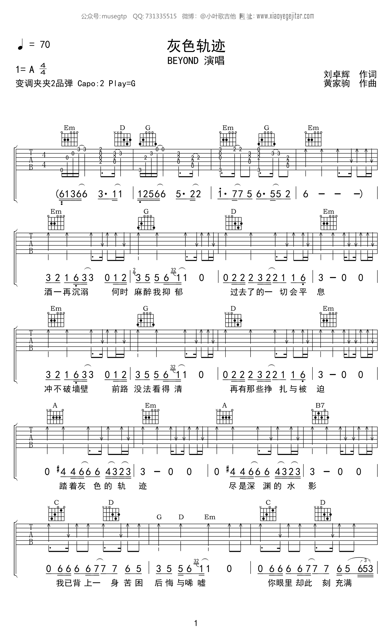 - 灰色轨迹吉他谱_Beyond_G调指法_弹唱六线谱