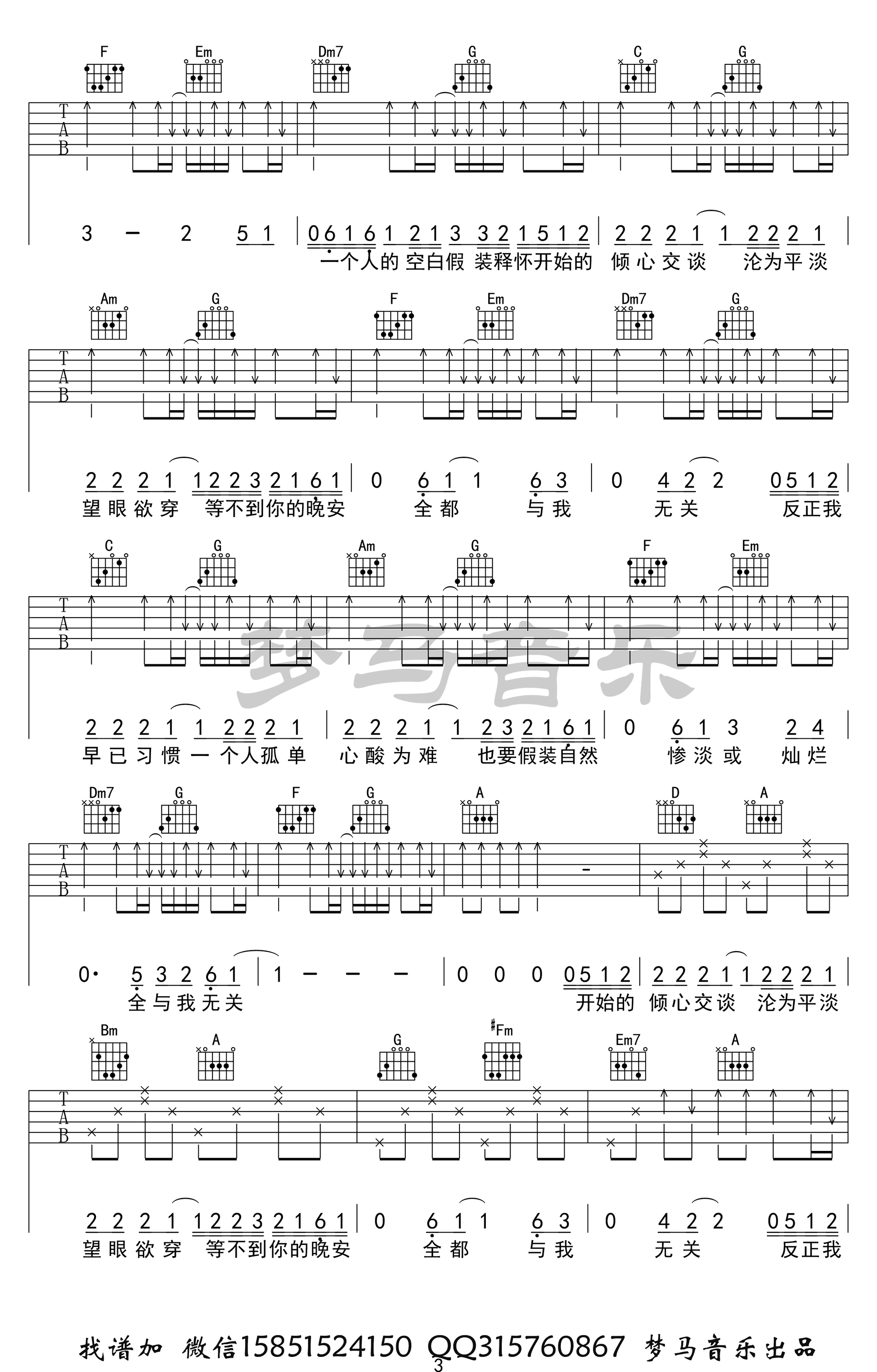 - 与我无关吉他谱_阿冗_G调指法_弹唱六线谱