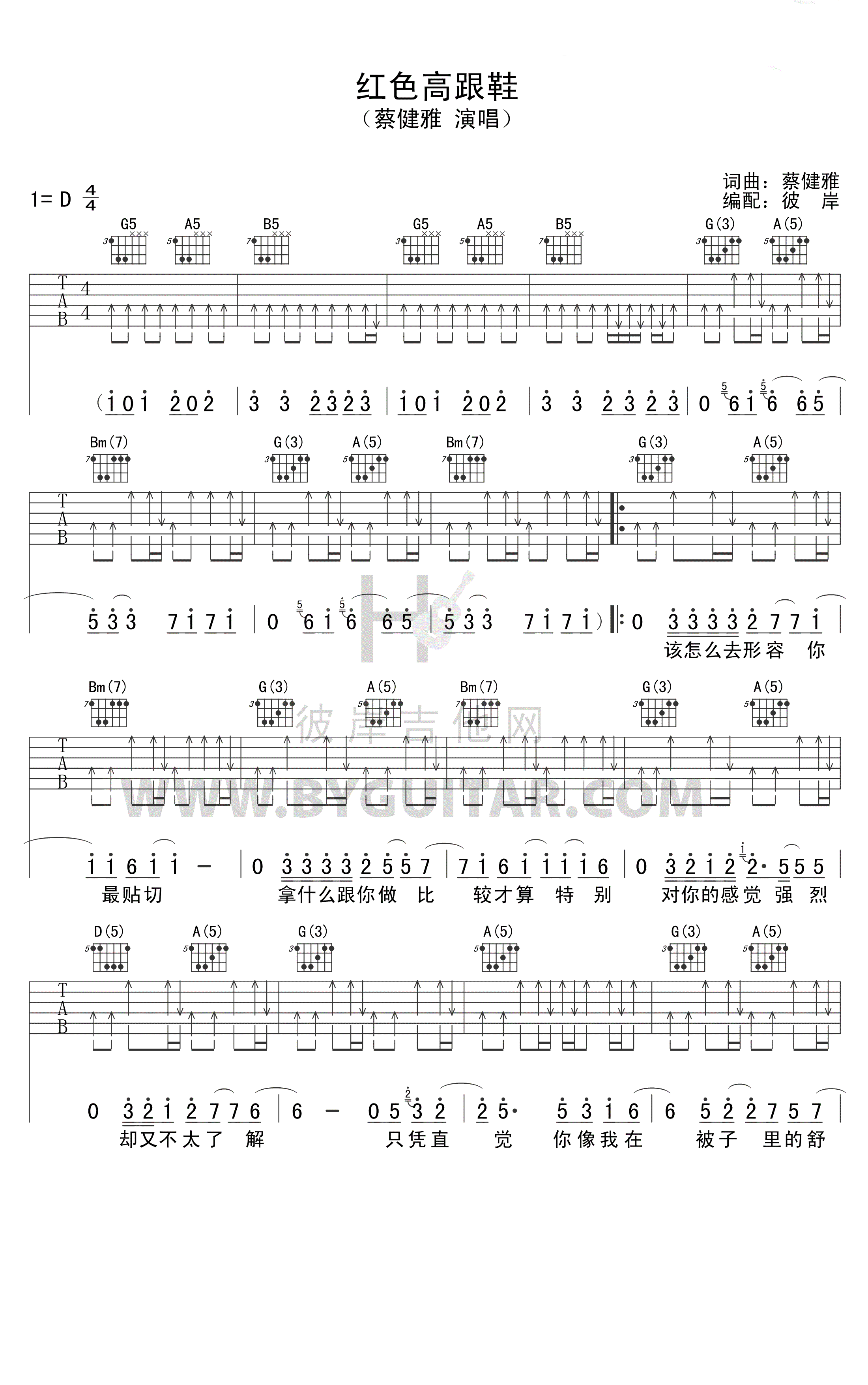 红色高跟鞋吉他谱_D调_蔡健雅_弹唱六线谱