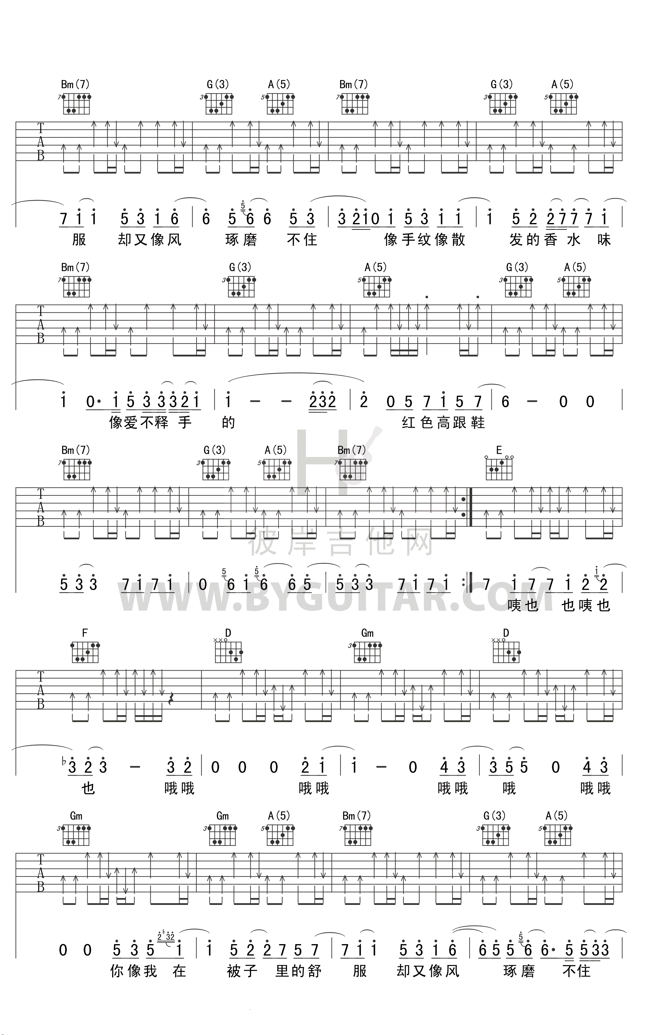 红色高跟鞋吉他谱蔡健雅 易唱网蔡健雅《红色高跟鞋》吉他谱,D调指法,电影《爱情呼叫转移2》的主题曲,红色高跟鞋吉他弹唱谱,六线谱由彼岸编配,易唱网整理上传。本吉他谱为图片格式,一共三张谱例。