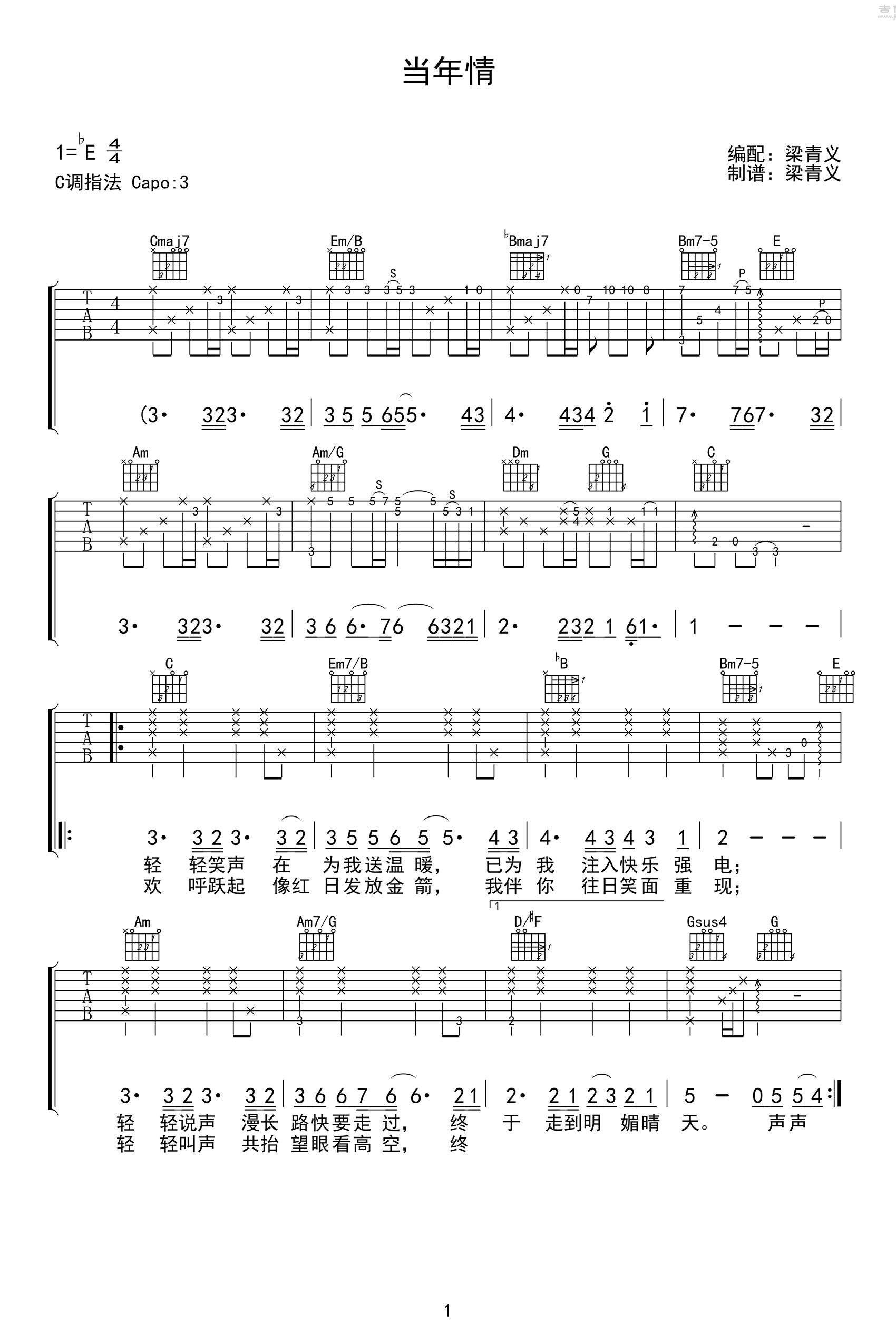 当年情吉他谱,张国荣的一首经典粤语歌曲,也是电影《英雄本色》主题曲。当年情吉他弹唱谱,选用C调指法,变调夹夹三品。三张高清图片六线谱,由梁青义编配制谱,易唱网上传分享。一首看似是情歌,但其实是一首超越情歌的作品。歌声以温馨和真的心绪,带着悠悠的惆怅,来感谢人生中的知己好友,熟悉的旋律中,记忆的点滴渐渐浮出脑海。
