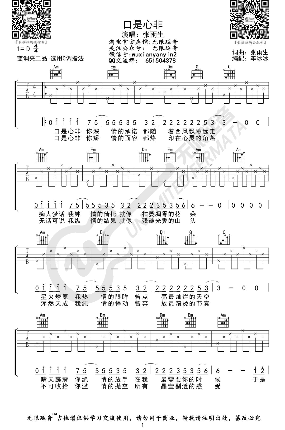 - 口是心非吉他谱_张雨生_C调弹唱谱_经典歌曲