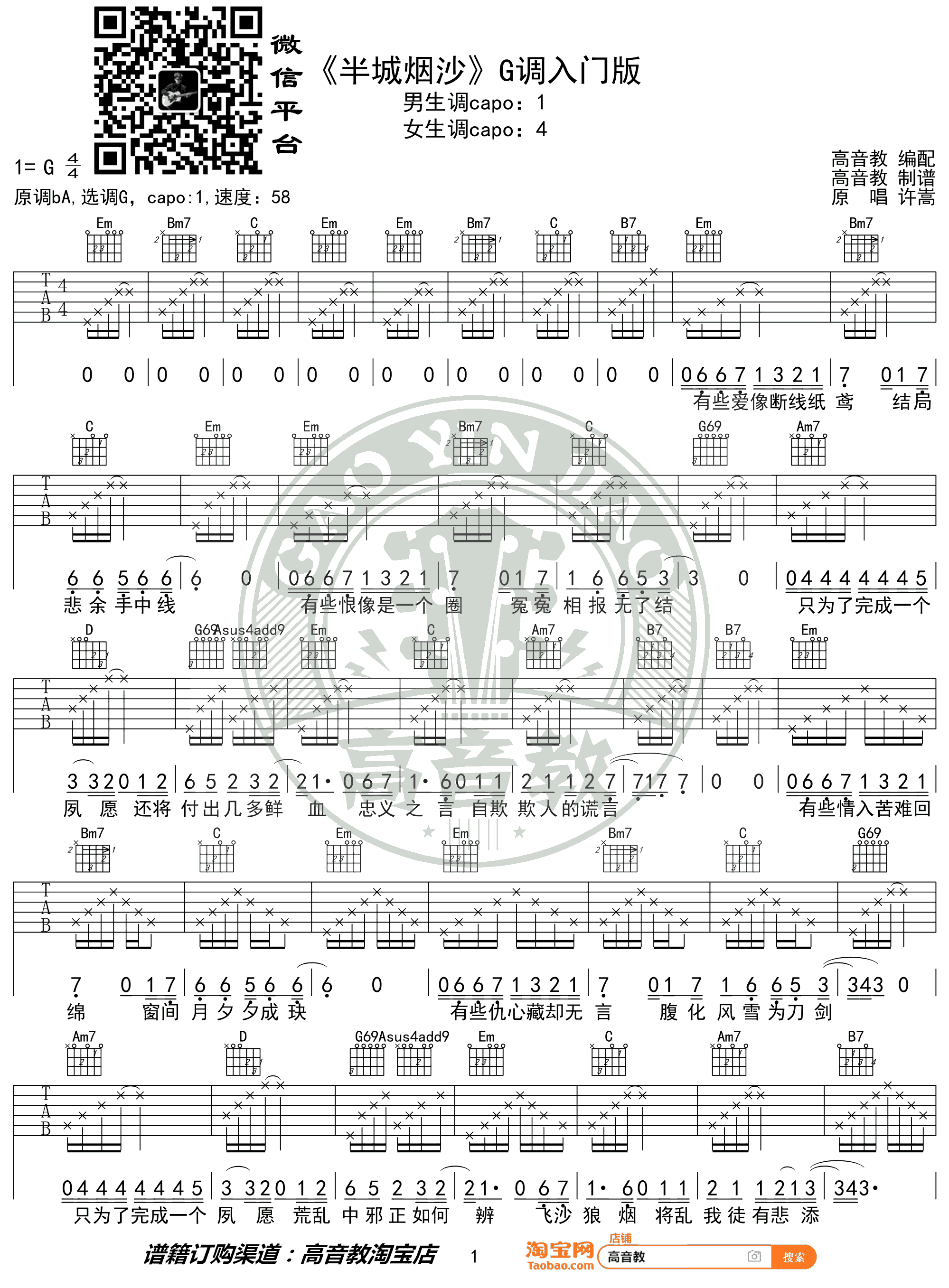 - 半城烟沙吉他谱_许嵩_G调简单版_入门弹唱谱