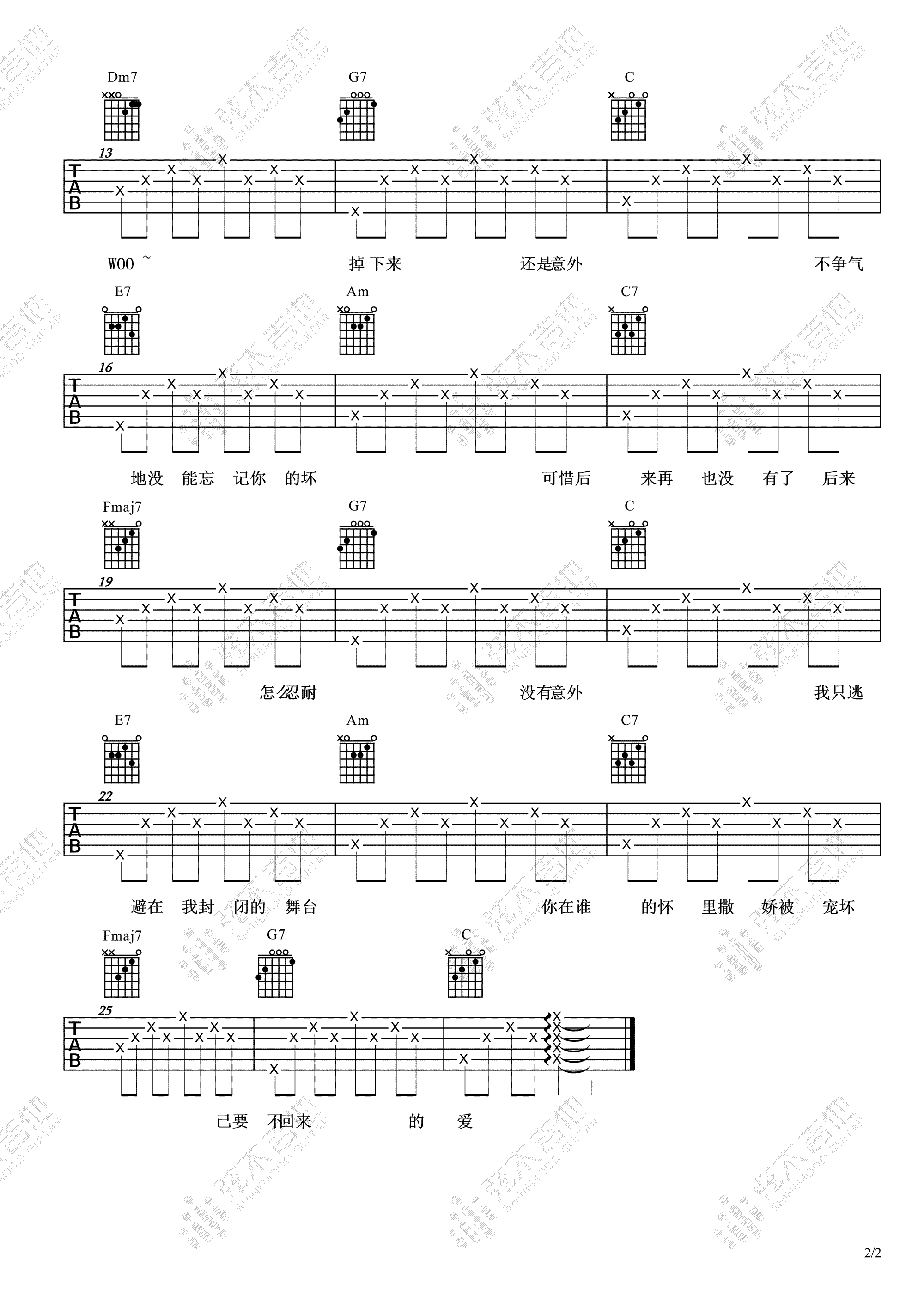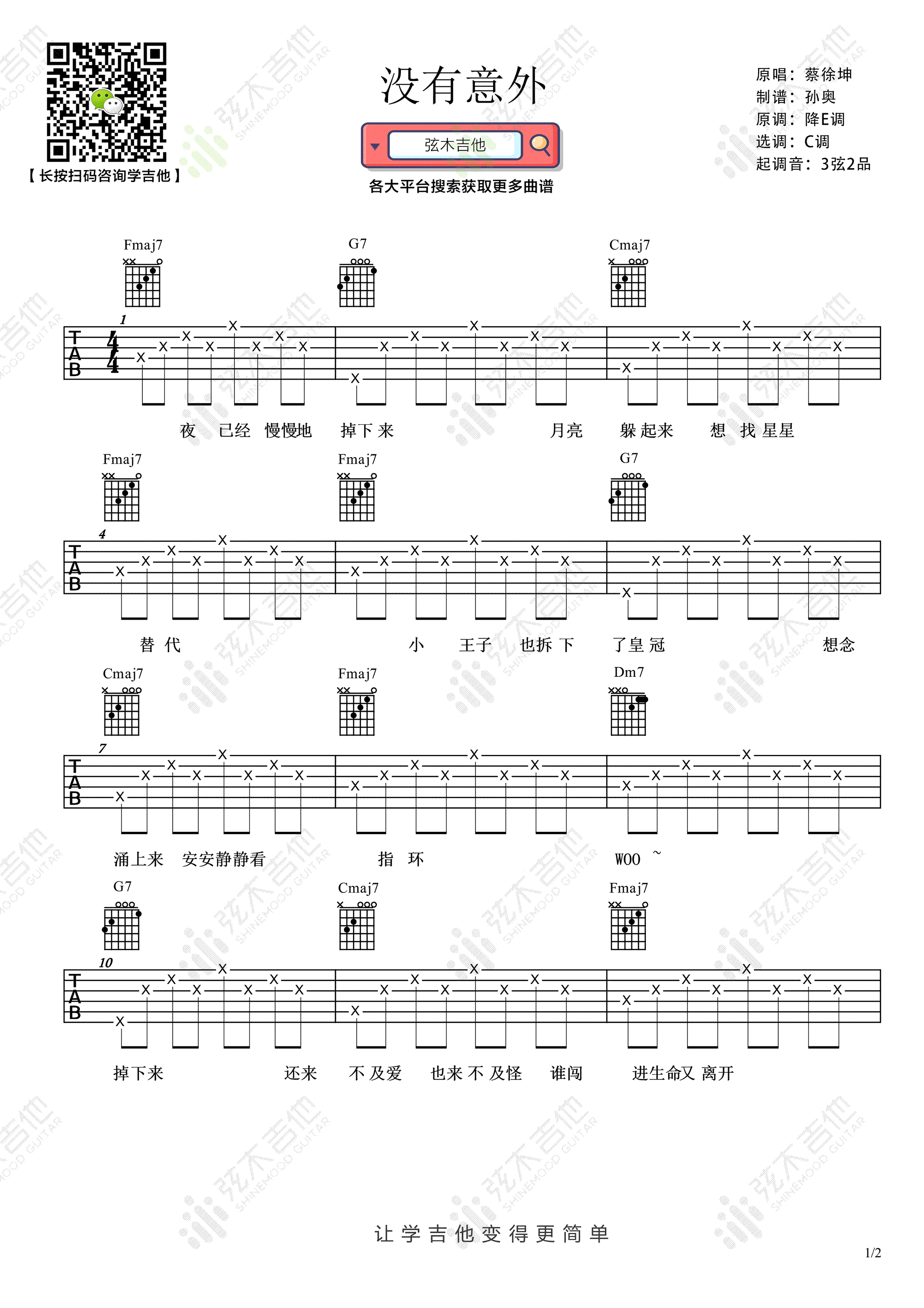 没有意外吉他谱,蔡徐坤创作演唱,没有意外六线谱,原调降E选调C,起调音三弦二品,两张高清弹唱图片谱。弦木吉他编配出品,易唱网更新上传。一首关于失去的抒情歌曲,极具童话感的温柔旋律,走心作词充满了浪漫的意象,将记忆里的故事娓娓道来,让人不禁追溯我们内心那段珍藏的过去。