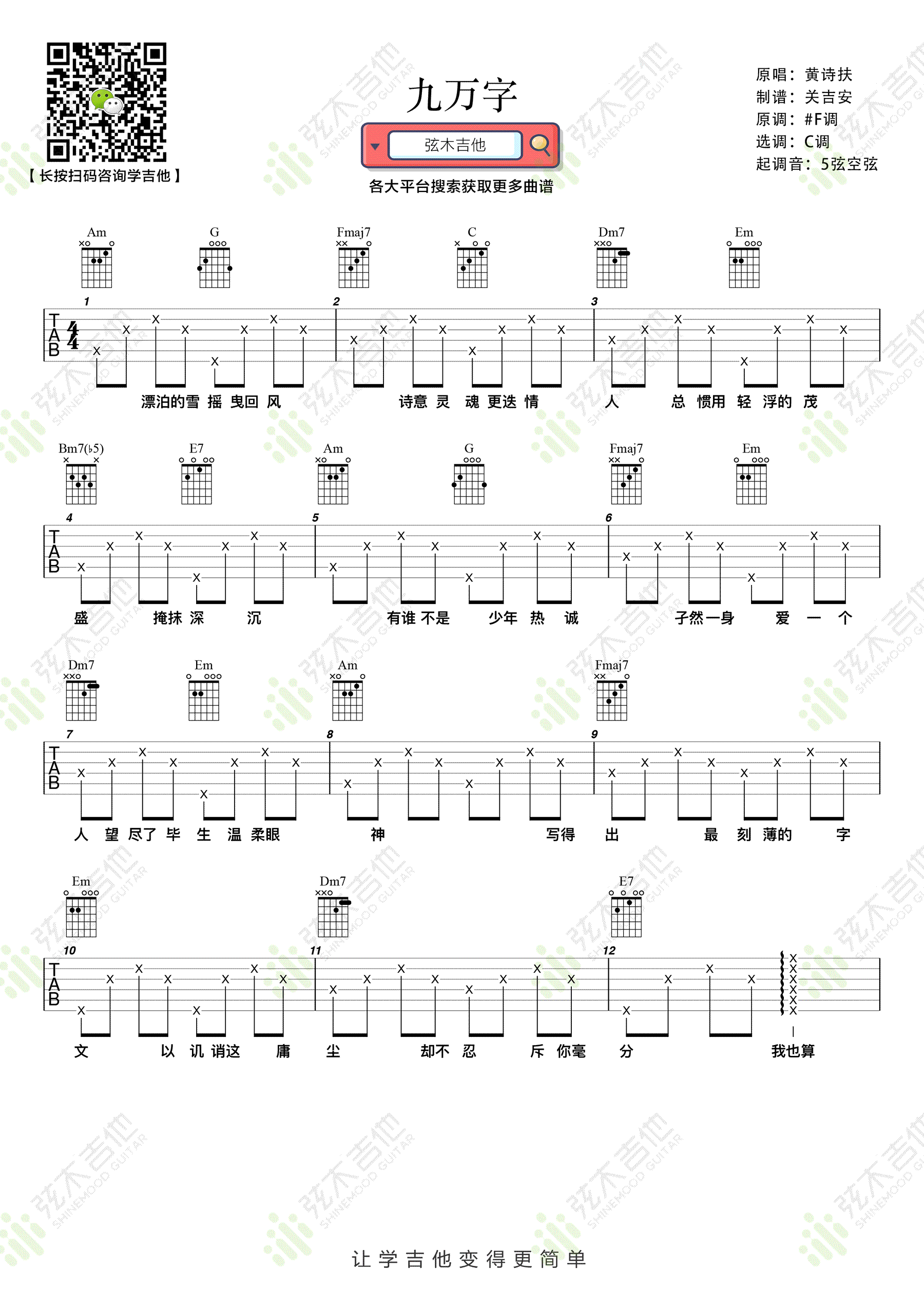 - 九万字吉他谱_黄诗扶_C调简单版_古风歌曲