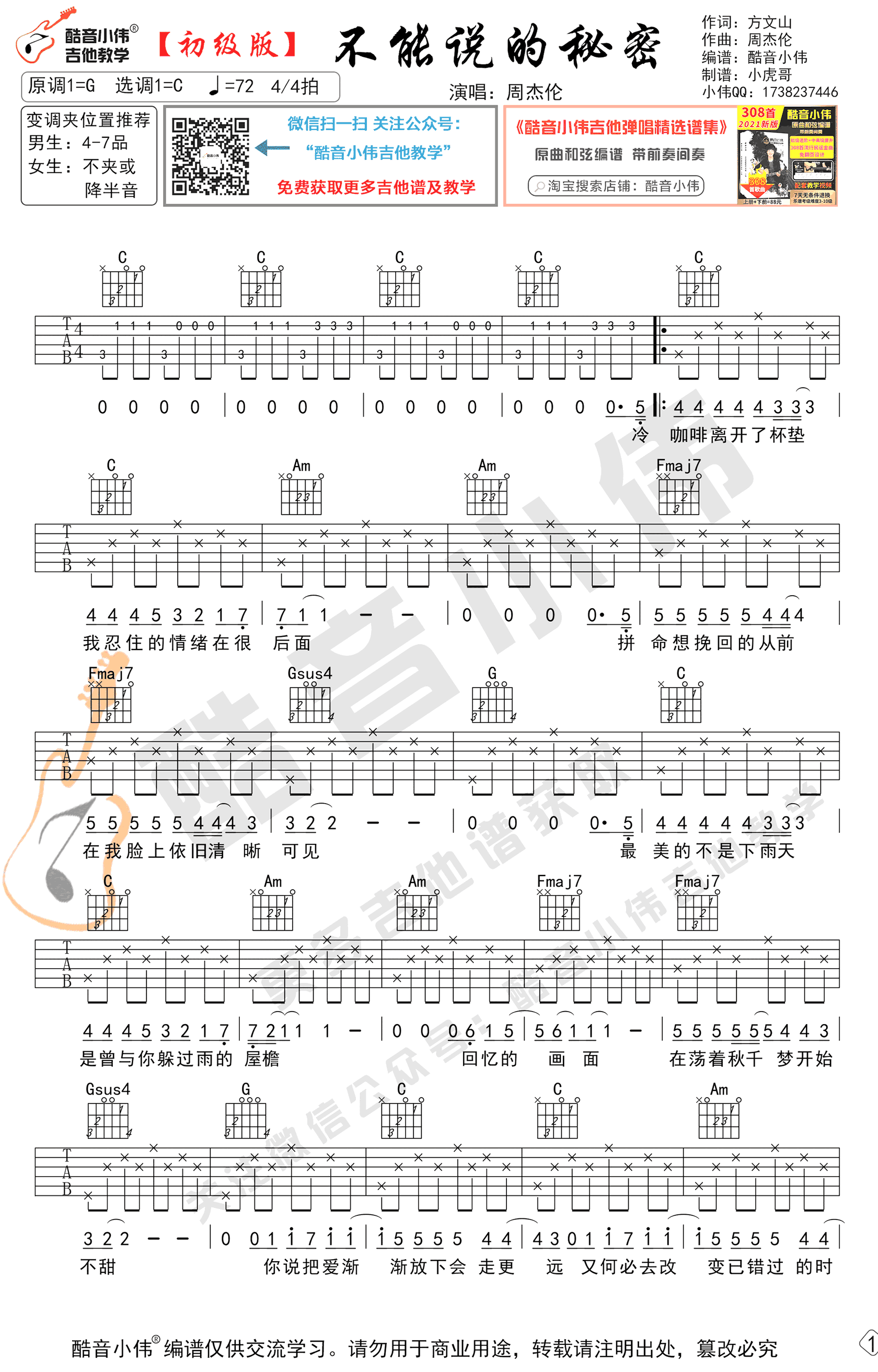 - 不能说的秘密吉他谱_周杰伦_C调简单版_弹唱谱