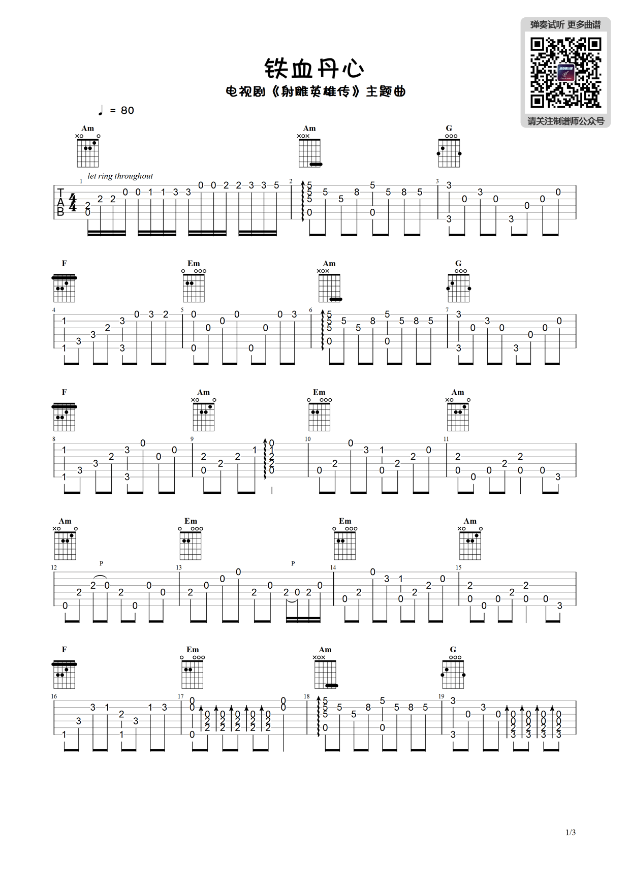 - 铁血丹心指弹谱_简单版_射雕英雄传主题曲_吉他独奏谱