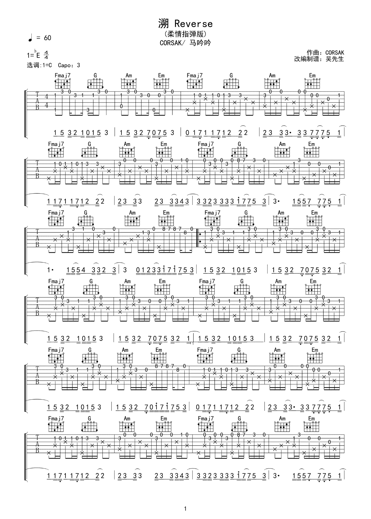 溯指弹谱_CORSAK胡梦周/马吟吟_C调_《溯》柔情指弹版
