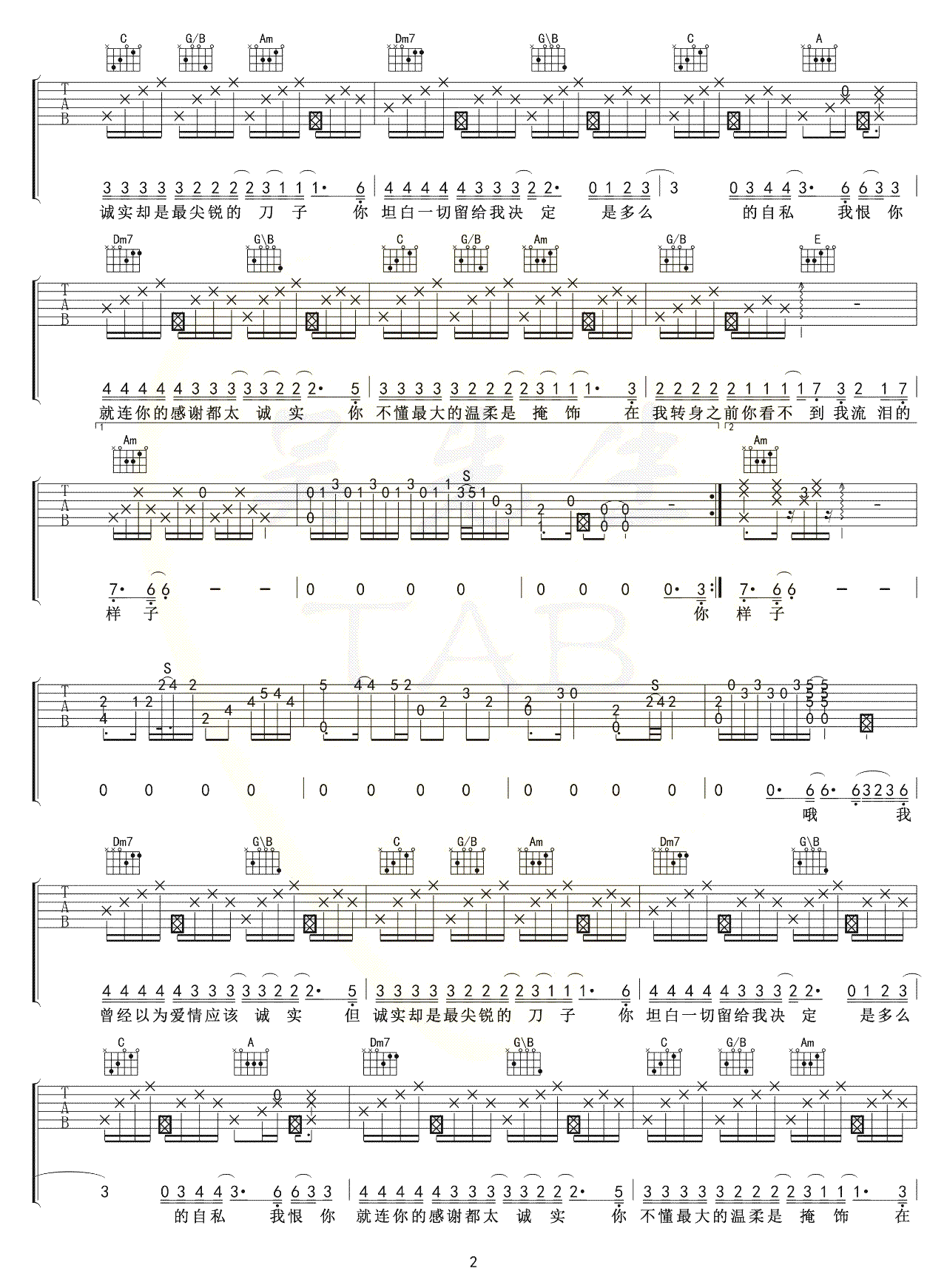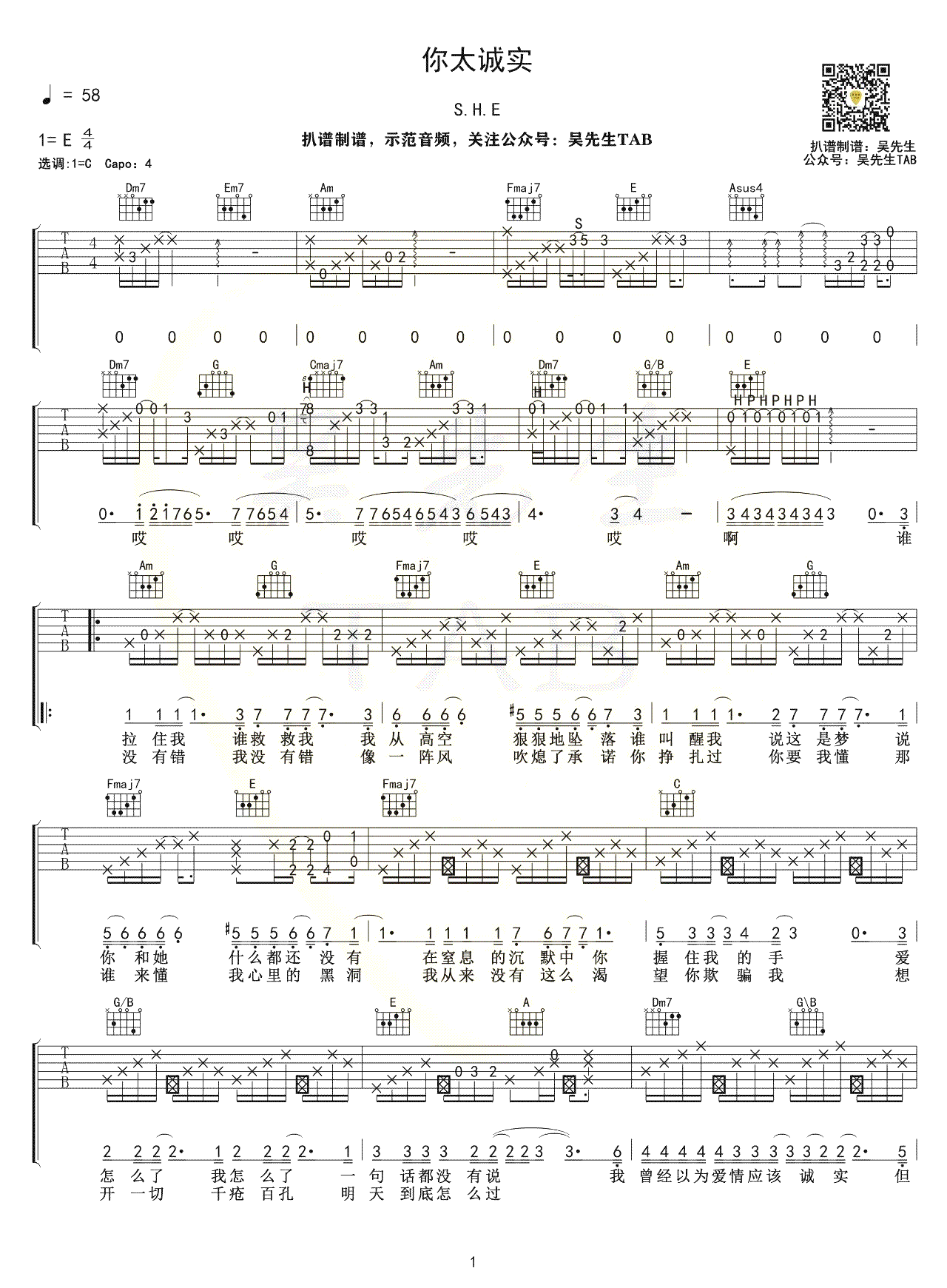 - 你太诚实吉他谱_SHE_C调指法_弹唱六线谱