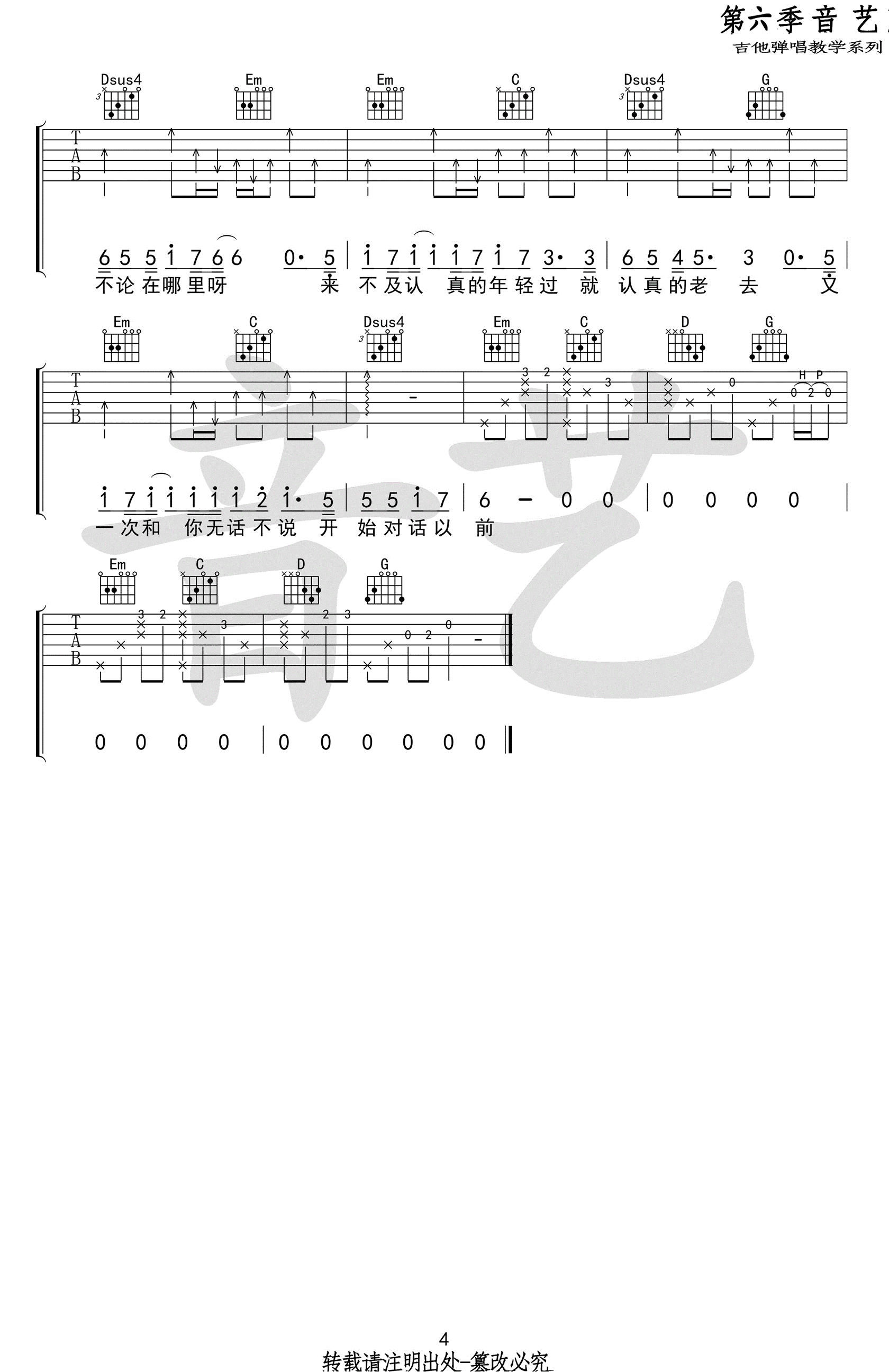 认真的老去六线谱,曹方演唱。本页展示的是《认真的老去》吉他谱第三四张图片谱。感谢音艺吉他出品,易唱网上传。