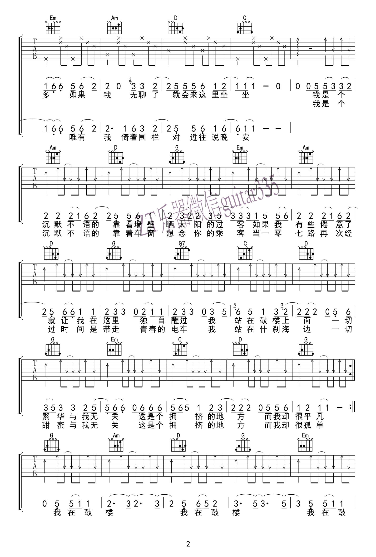 鼓楼 - 赵雷 词:赵雷 曲:赵雷 编曲:赵雷/喜子 制作人:赵雷/喜子/姜北生 贝斯:张岭 鼓:贝贝 电琴:喜子 箱琴:赵雷 口琴:赵雷 MIDI:喜子 和声:赵雷/孙嫣然/唐宁 我走在鼓楼下面 路在堵着 雨后的阳光洒落 人们都出来了 执着的迷惘的文艺青年很多 如果我无聊了就会来这里坐坐 我是个沉默不语的 靠着墙壁晒太阳的过客 如果我有些倦意了 就让我在这里独自醒过 我站在鼓楼上面 一切繁华与我无关 这是个拥挤的地方 而我却很平凡 我走在鼓楼下面 淋湿的咖啡馆 睡不着的后海边 月亮还在抽着烟 喝醉的亲吻着 快活的人不眠 唯有我倚着围栏 对过往说晚安 我是个沉默不语的 靠着车窗想念你的乘客 当107 路再次经过 时间是带走青春的电车 我站在什刹海边一切甜蜜与我无关 这是个拥挤的地方 而我却很孤单 我在鼓楼 我在鼓楼