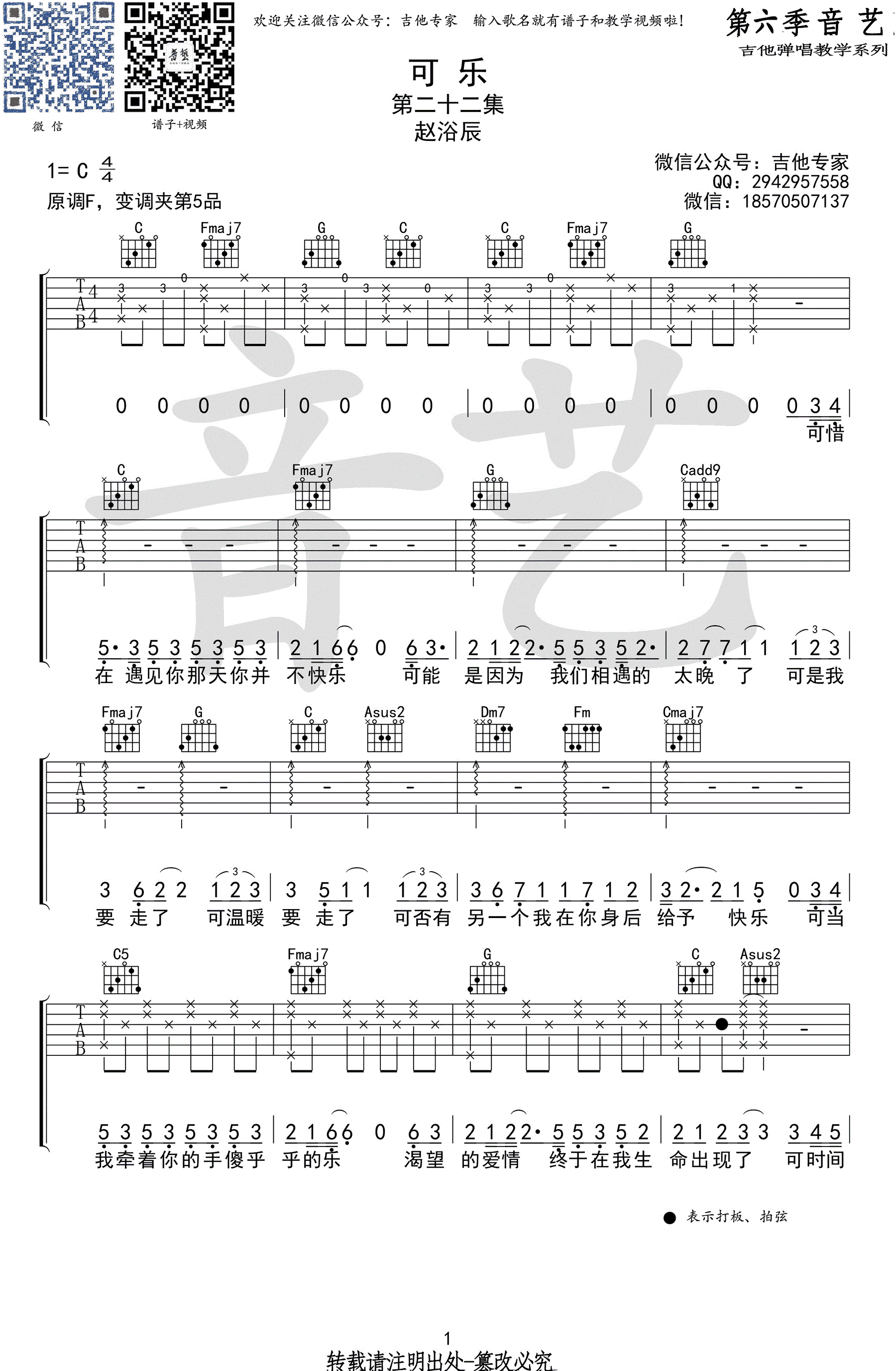 赵浴辰《可乐》吉他谱,C调弹唱高清六线谱,CAPO夹5品。。赵紫骅一首原创歌曲,可乐吉他谱,四张图片谱两页呈现浏览。