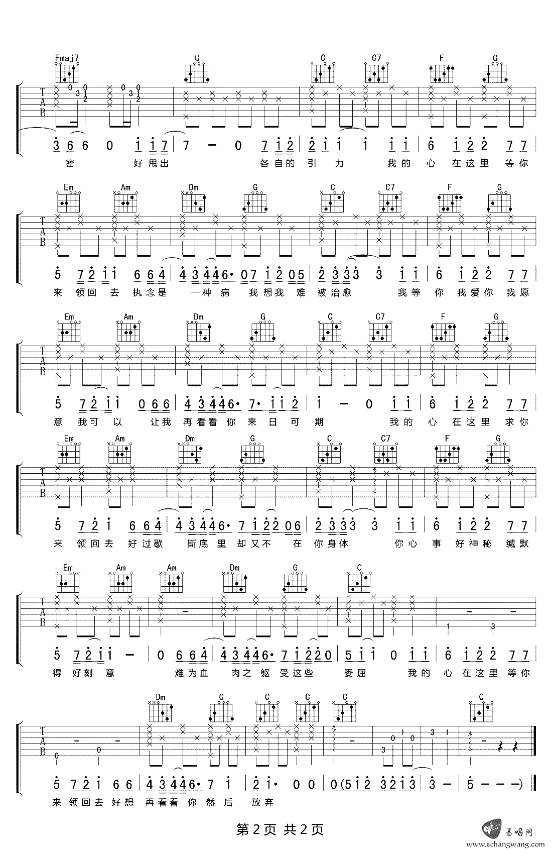 - 纸短情长吉他谱C调 烟把儿 吉他弹唱简单版 图片谱