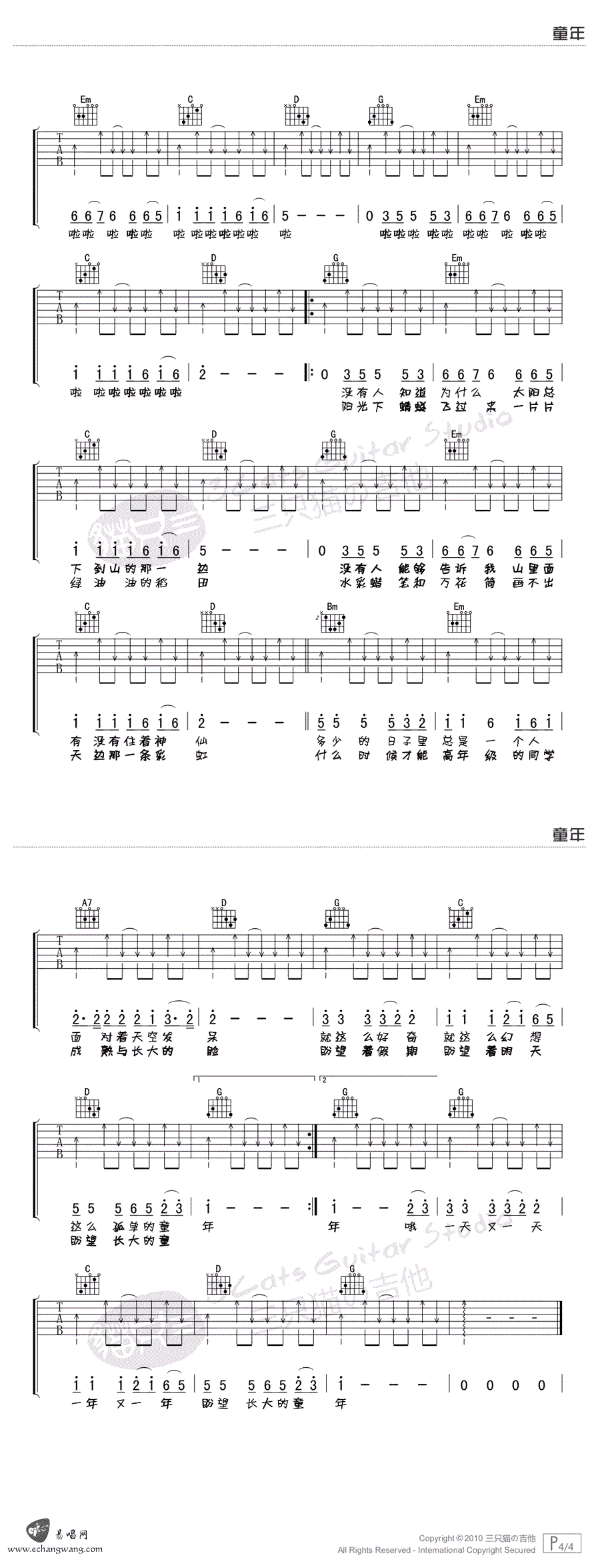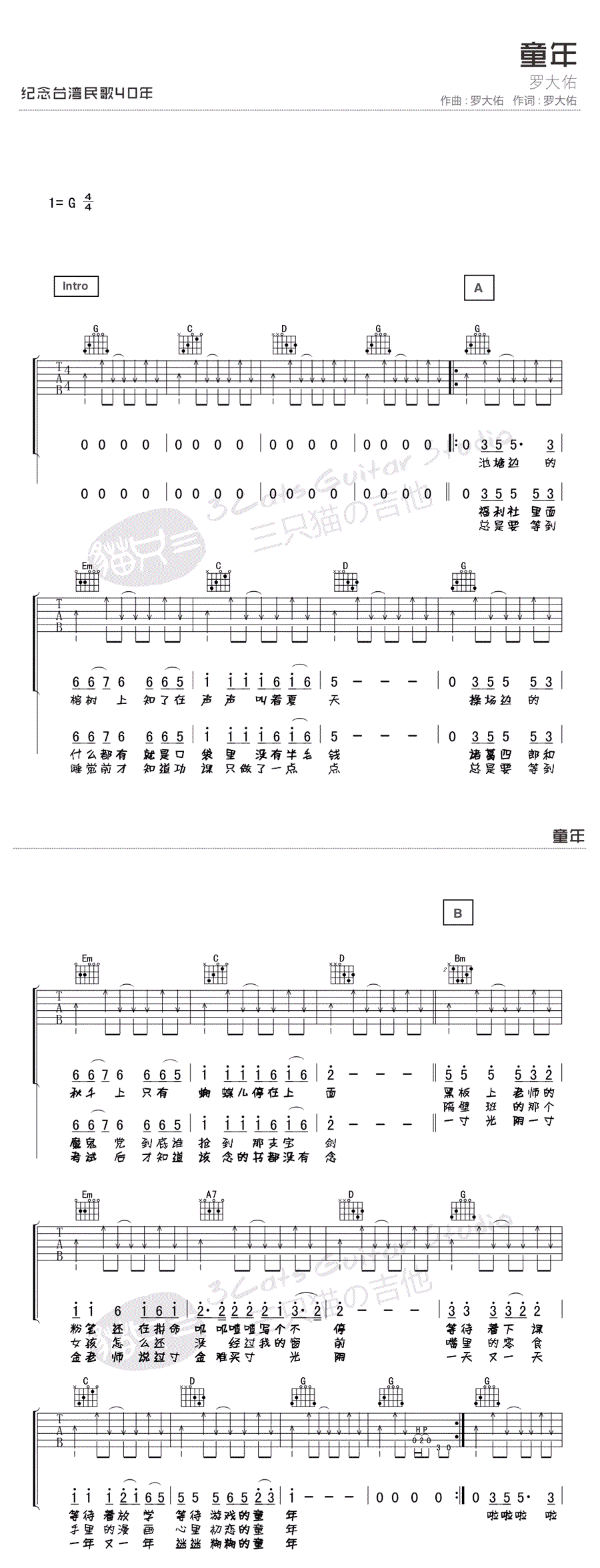 - 童年吉他谱 罗大佑 G调图片谱 吉他弹唱视频示范