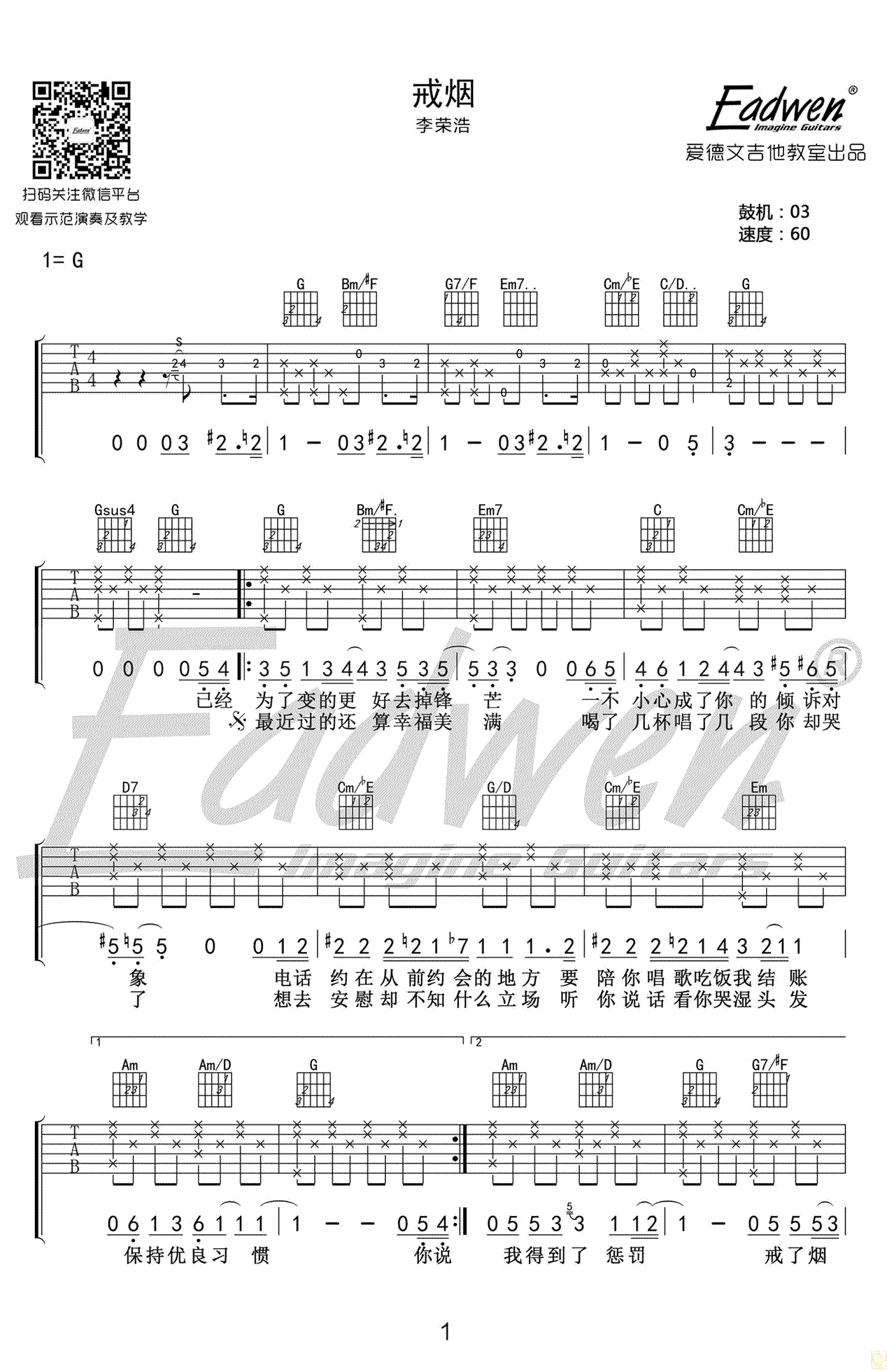 - 李荣浩《戒烟》吉他谱 G调弹唱谱 图片谱高清版