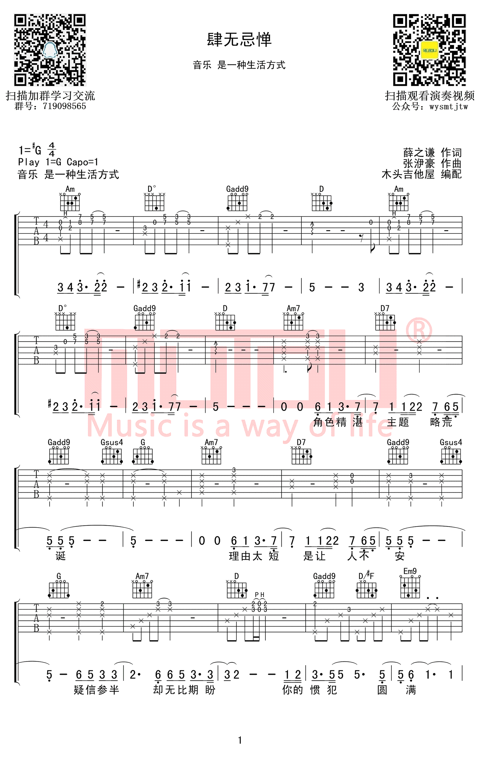 - 肆无忌惮吉他谱 薛之谦 G调指法 弹唱六线谱