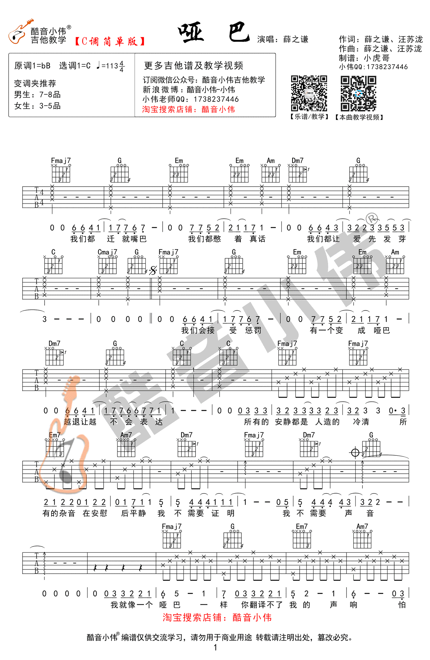 - 薛之谦 哑巴吉他谱 G调弹唱谱 《哑巴》吉他教学视频