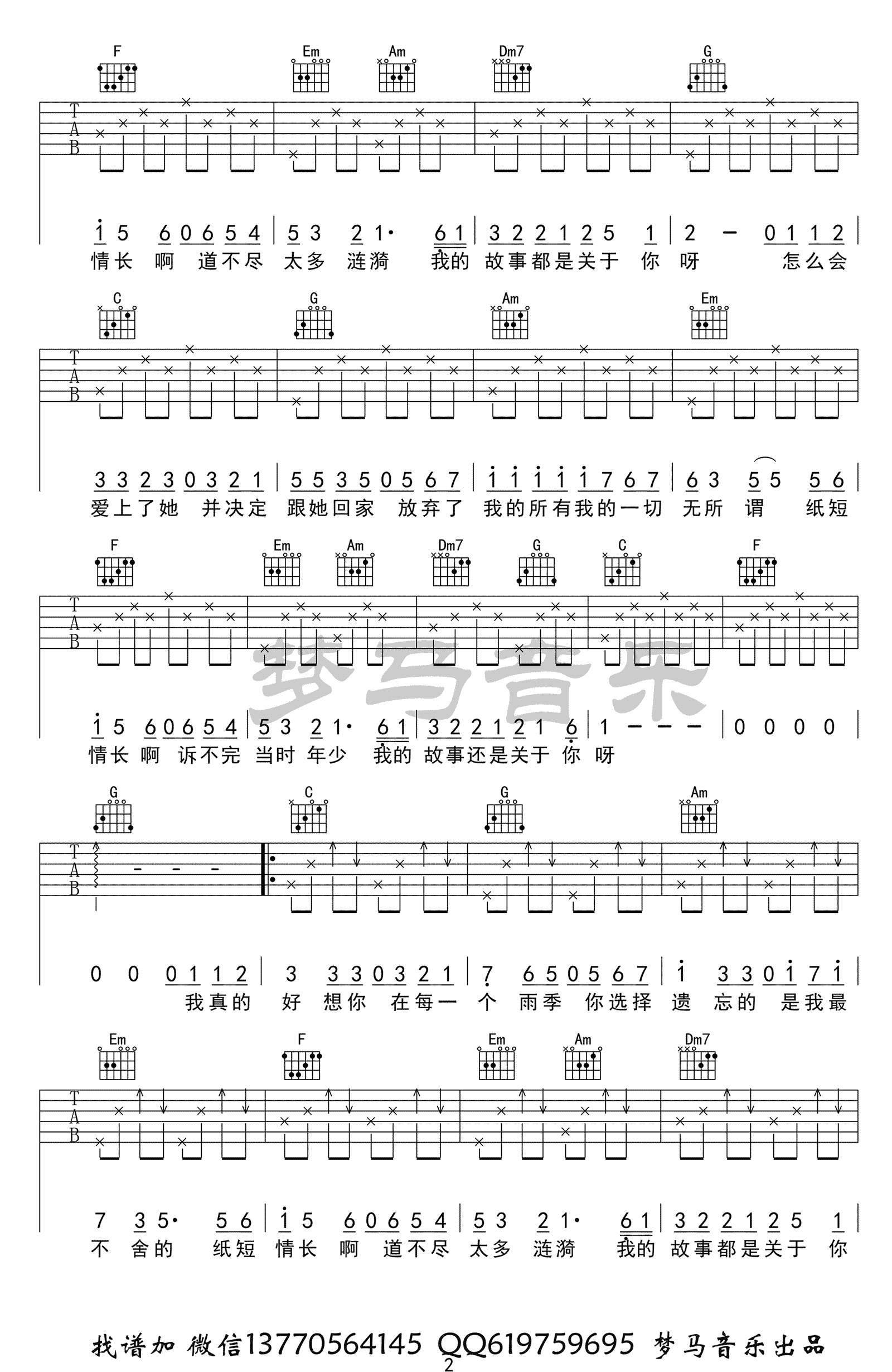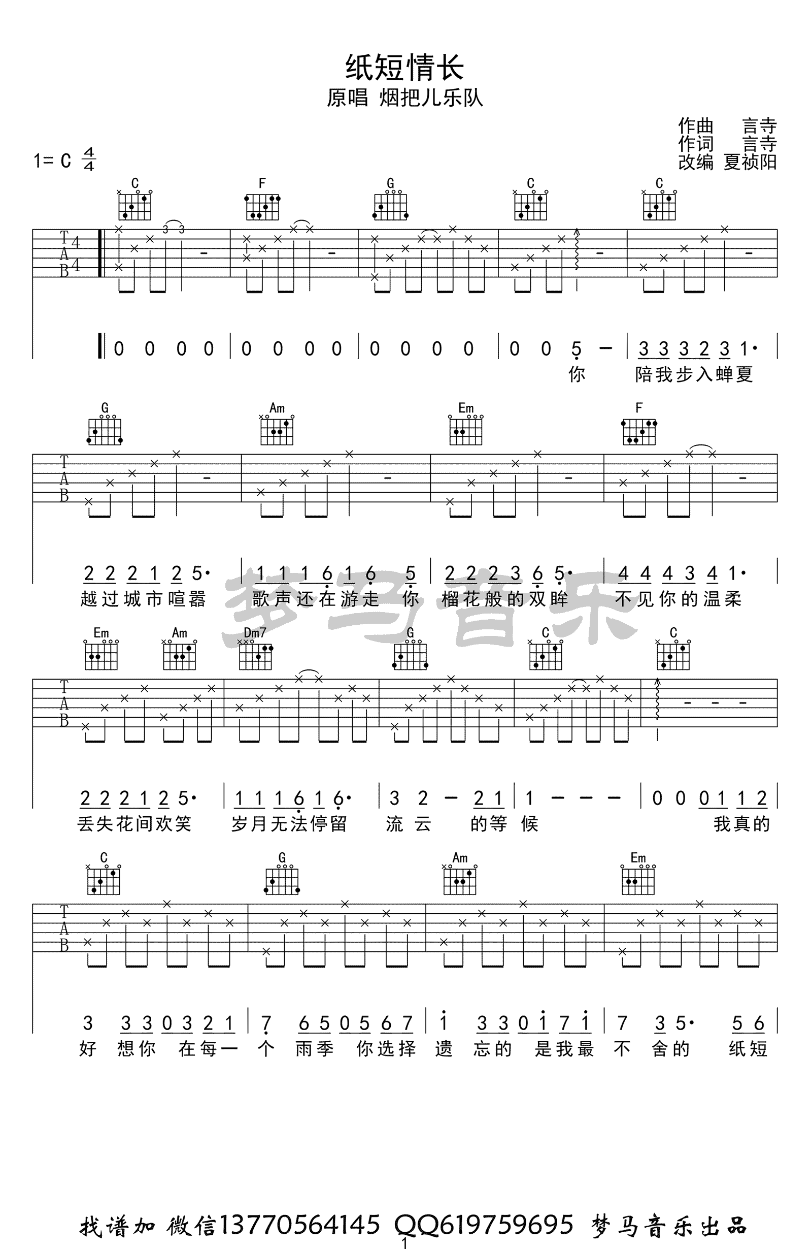 - 纸短情长吉他谱 C调 吉他弹唱+教学视频 小磊吉他编配