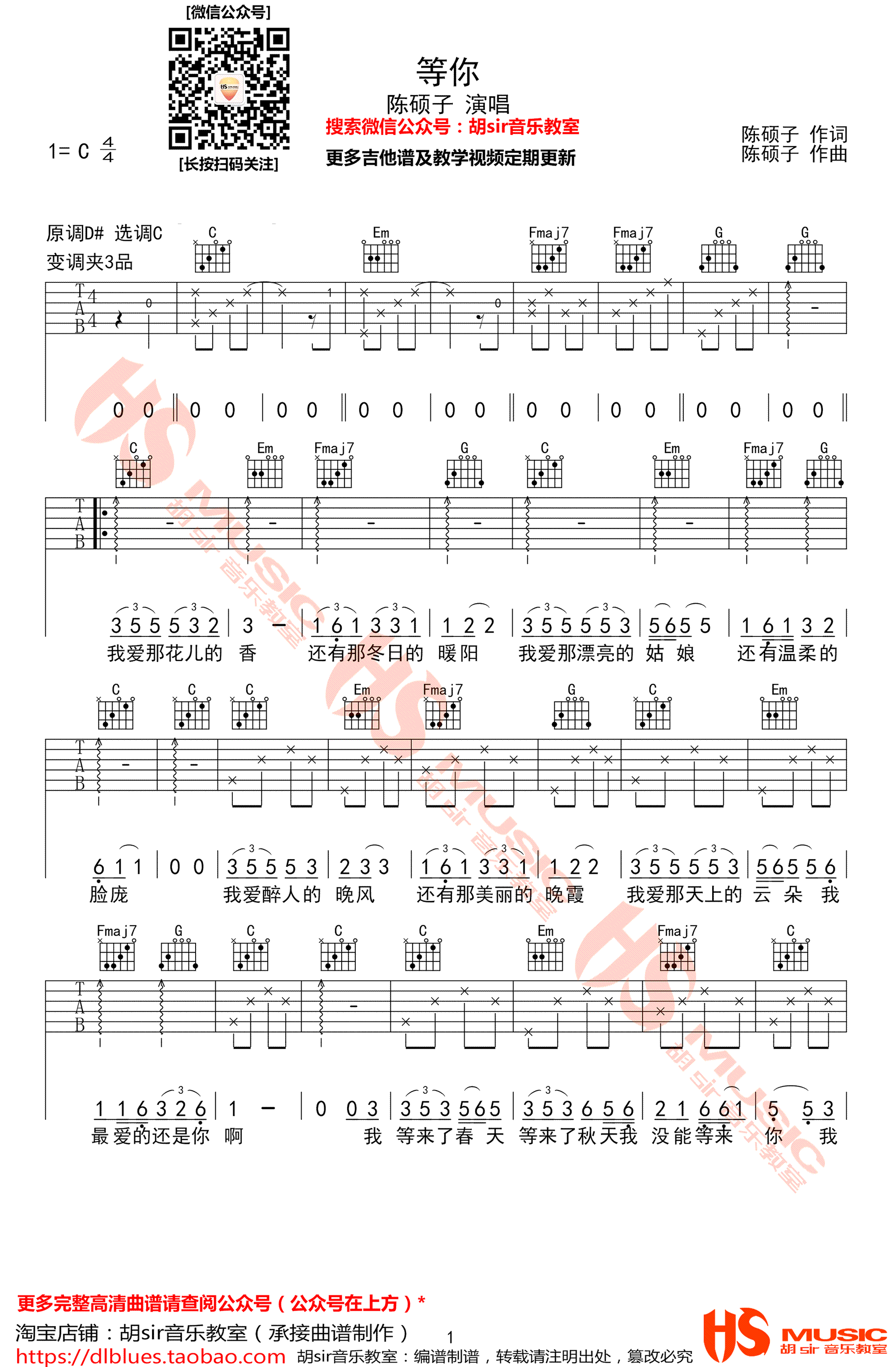 等你陈硕子吉他谱C调 易唱网 《等你》吉他谱,继《凌晨三点》后,陈硕子新歌专辑中的一首原创民谣作品,等你六线谱,C调指法编配,高清图片谱,感谢胡sir音乐教室出品,易唱网上传分享。