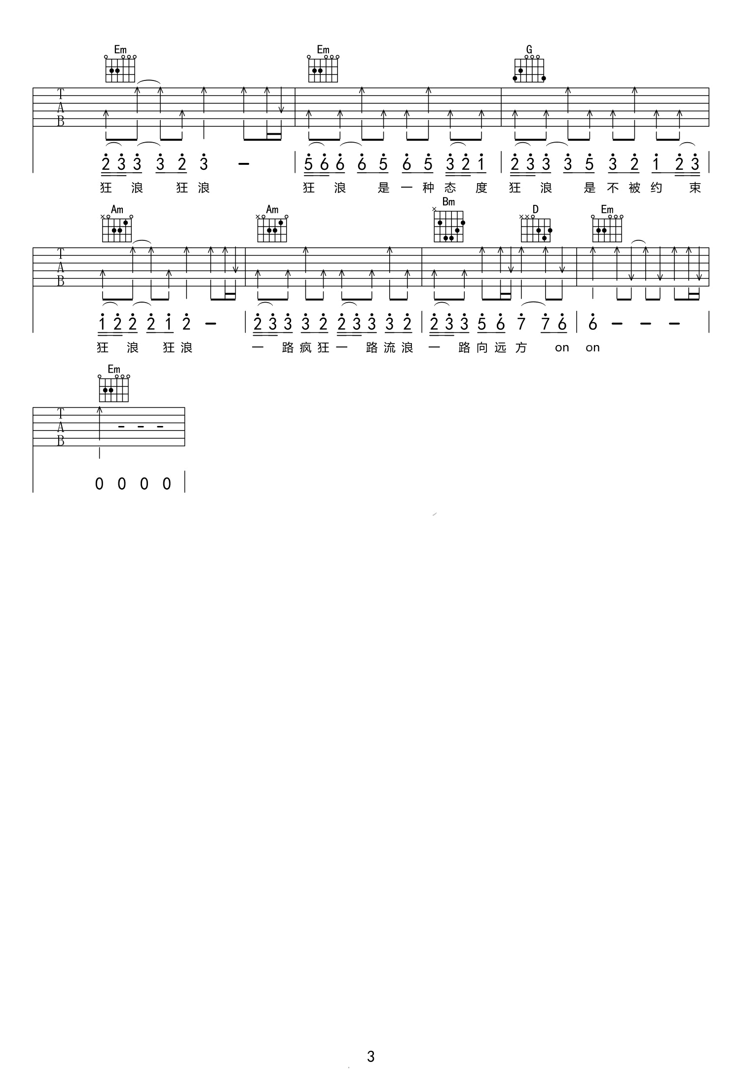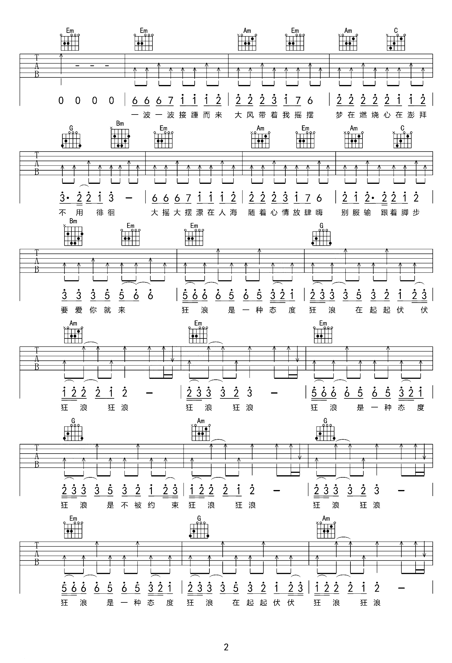 狂浪吉他谱_花姐《狂浪》弹唱六线谱_高清版
