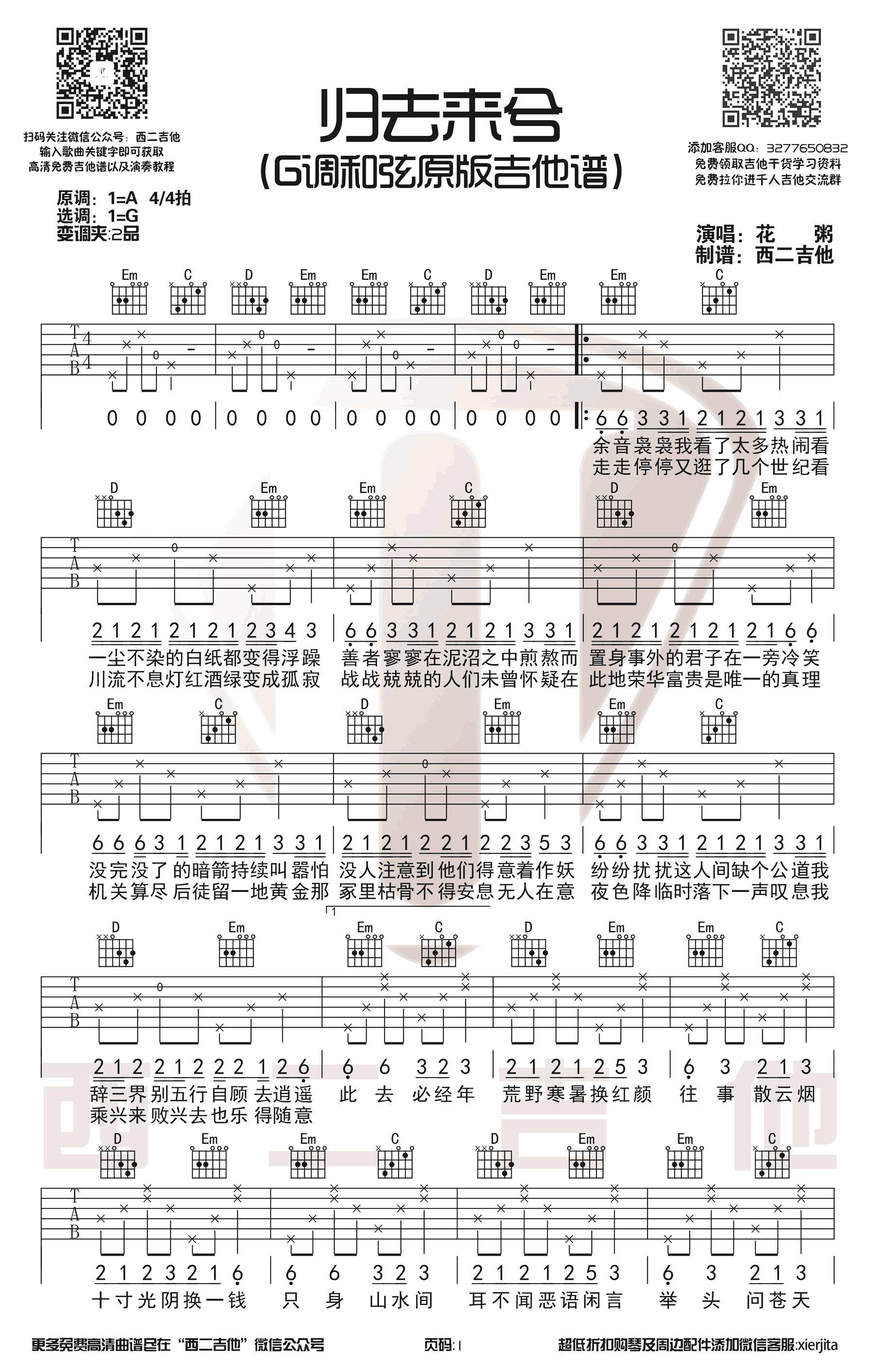 - 归去来兮吉他谱_花粥_G调六线谱_高清版