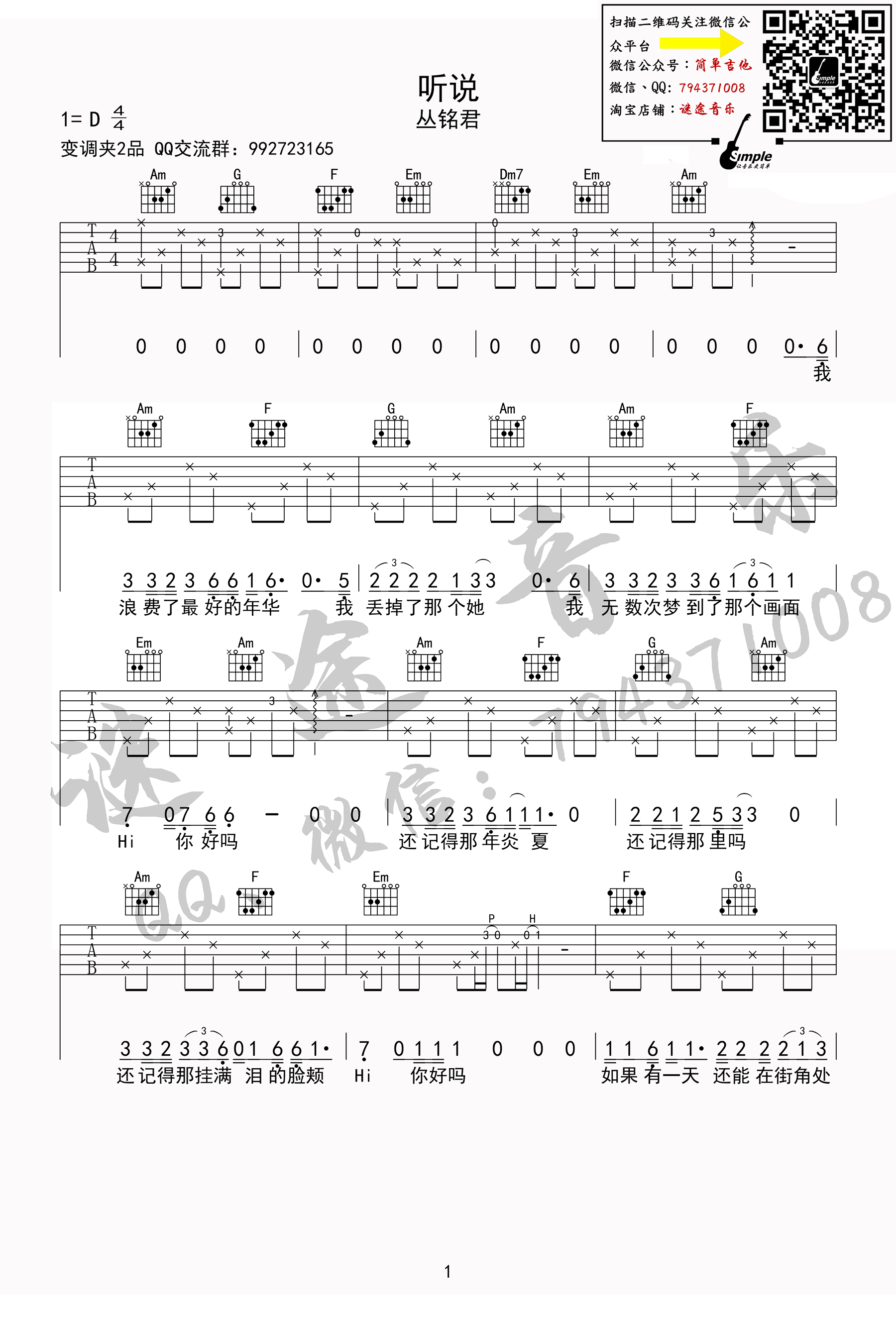 - 听说吉他谱_丛铭君_弹唱六线谱_高清版