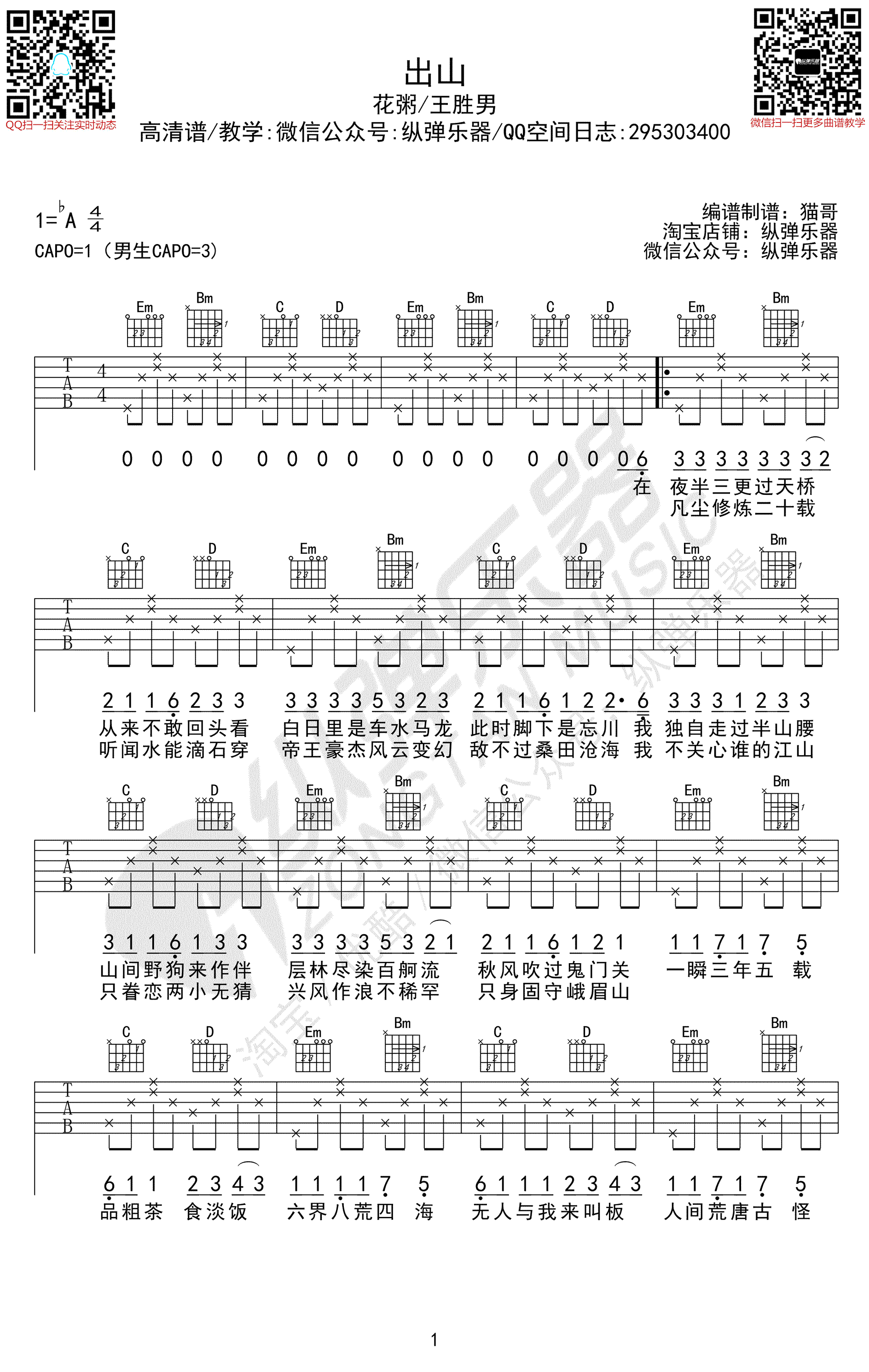 - 花粥《出山》吉他谱_弹唱教学视频_原版弹唱谱