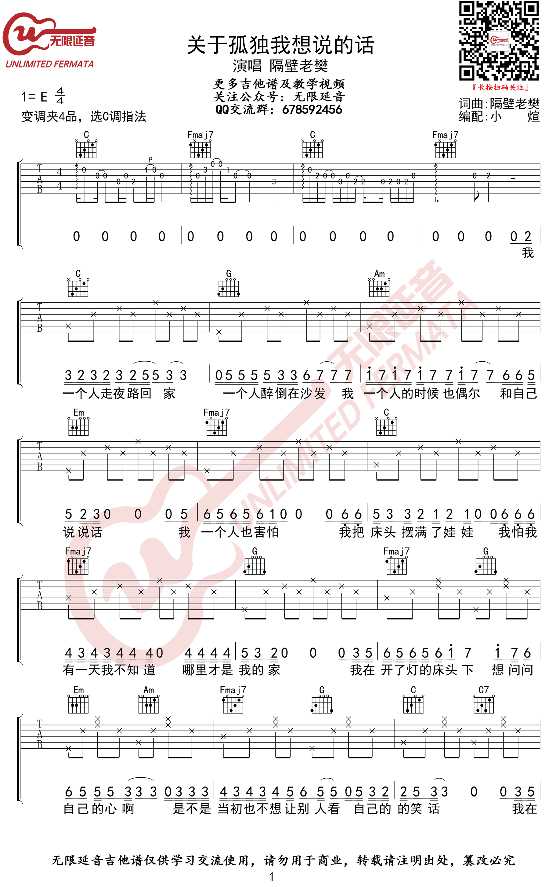 《关于孤独我想说的话》吉他谱,隔壁老樊演唱,原调E,变调夹夹四品,选用C调指法编配,《关于孤独我想说的话》六线谱,完整版共四张高清图片谱,无限延音编配出品,易唱网更新分享。