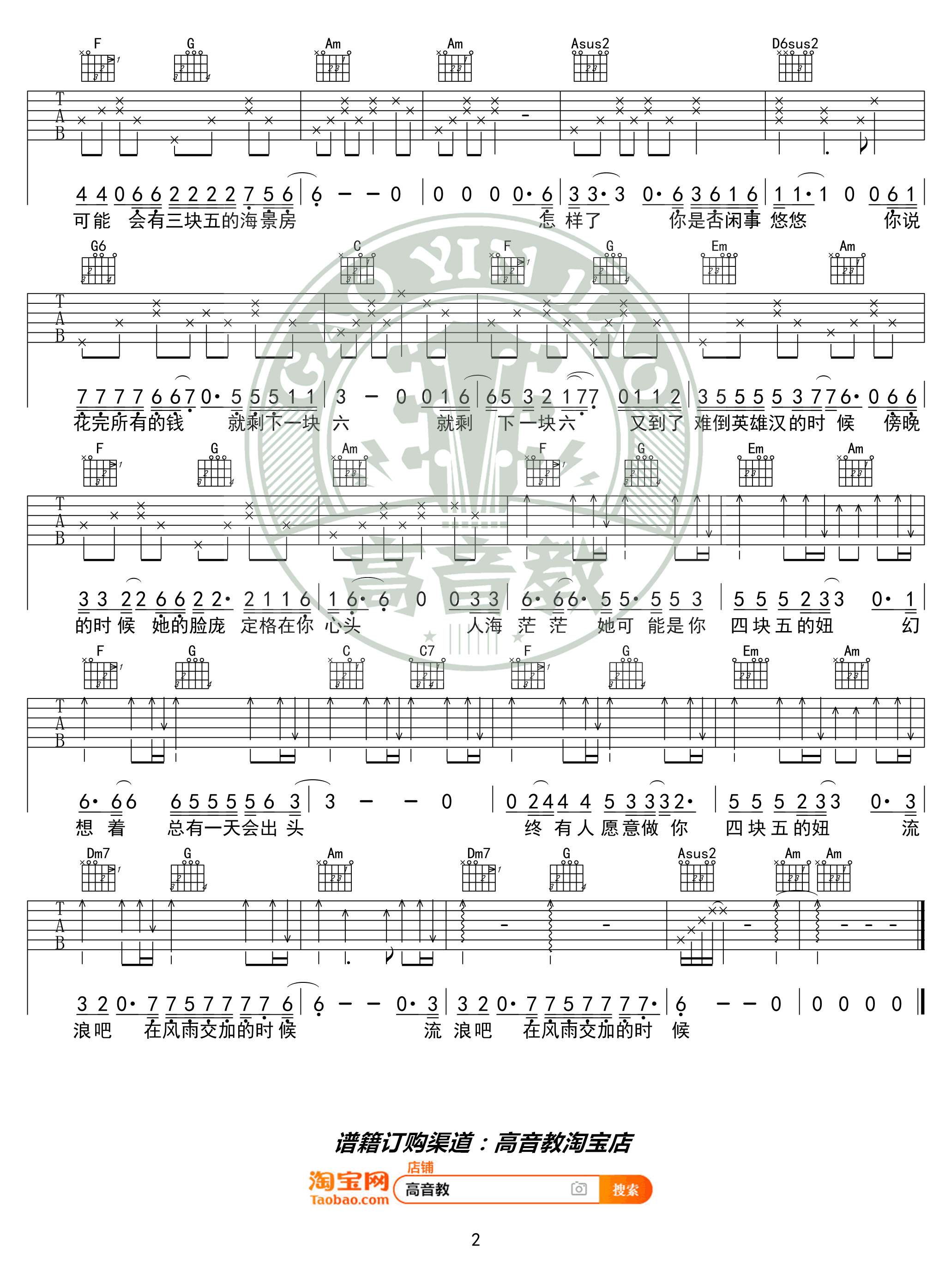 - 四块五吉他谱_隔壁老樊《四块五的妞》六线谱_C调指法