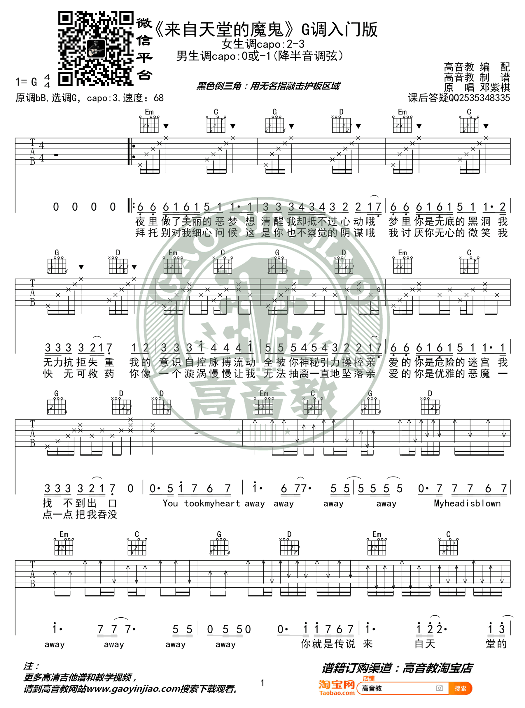 - 来自天堂的魔鬼吉他谱_邓紫棋_G调弹唱谱