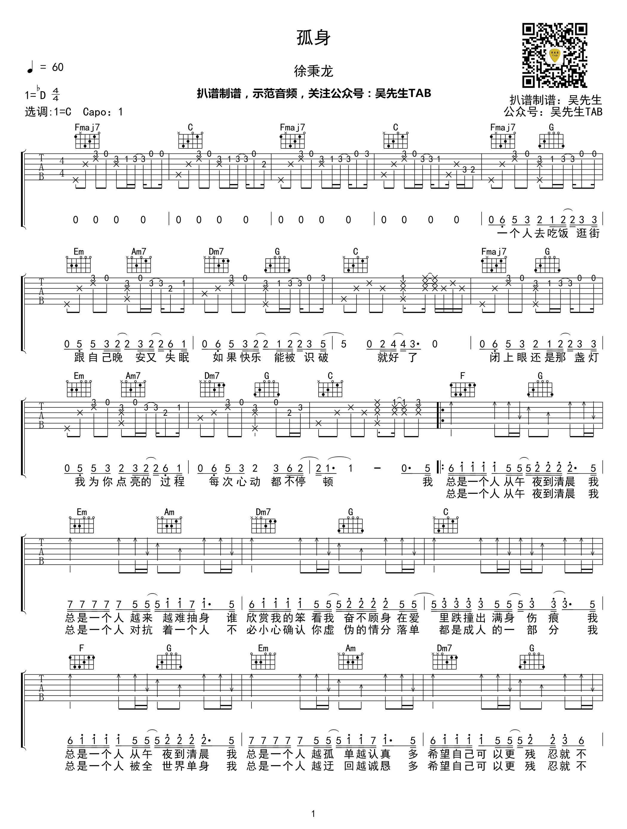 - 孤身吉他谱_徐秉龙_C调指法_弹唱六线谱