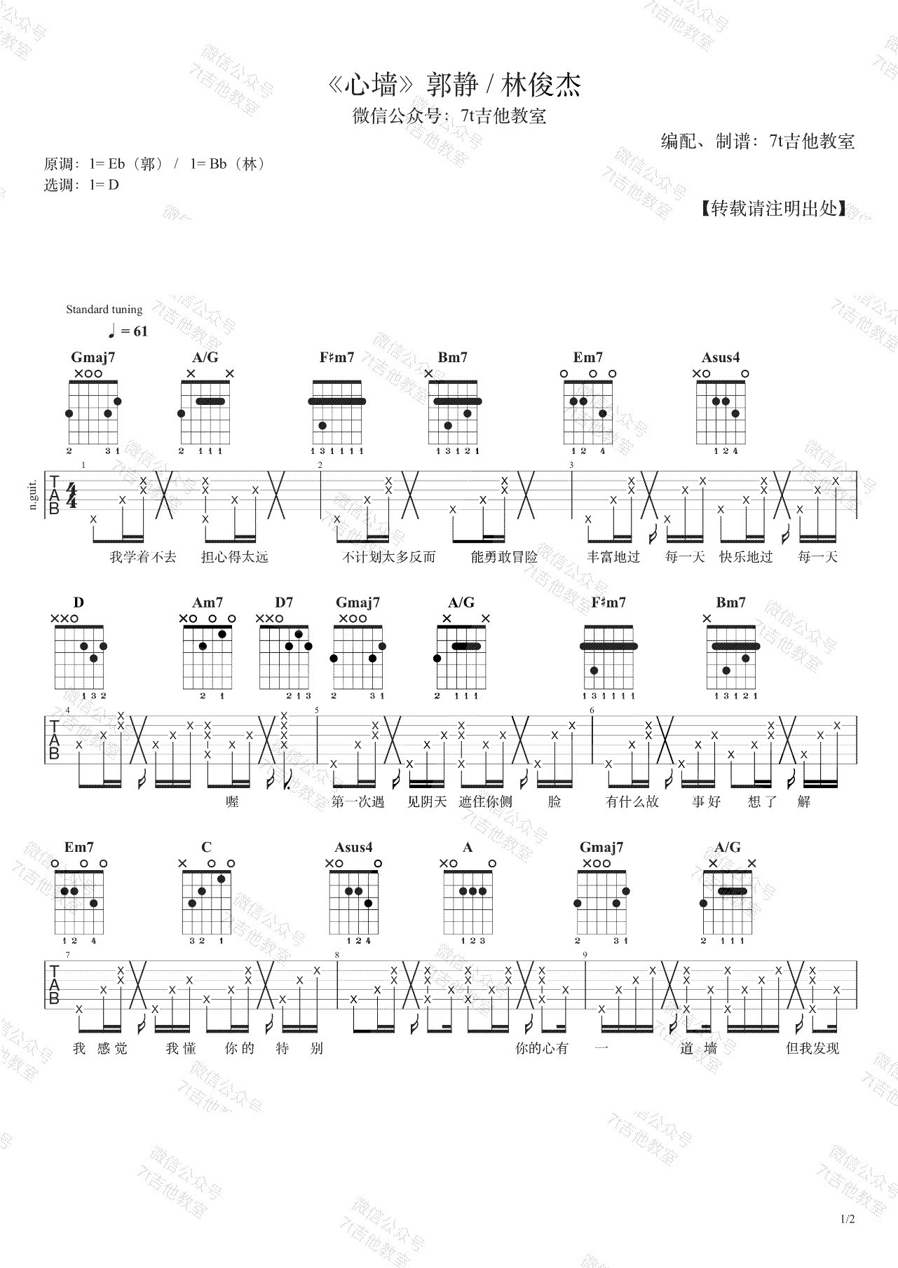 《心墙》吉他谱,这首歌曲有男女两个版本,分别由郭静和林俊杰演唱,是一首好听又经典的歌曲,最近在网上再次火了起来,感谢7T吉他教室出谱,蜜汁叉烧肠示范演唱,易唱网整理上传。