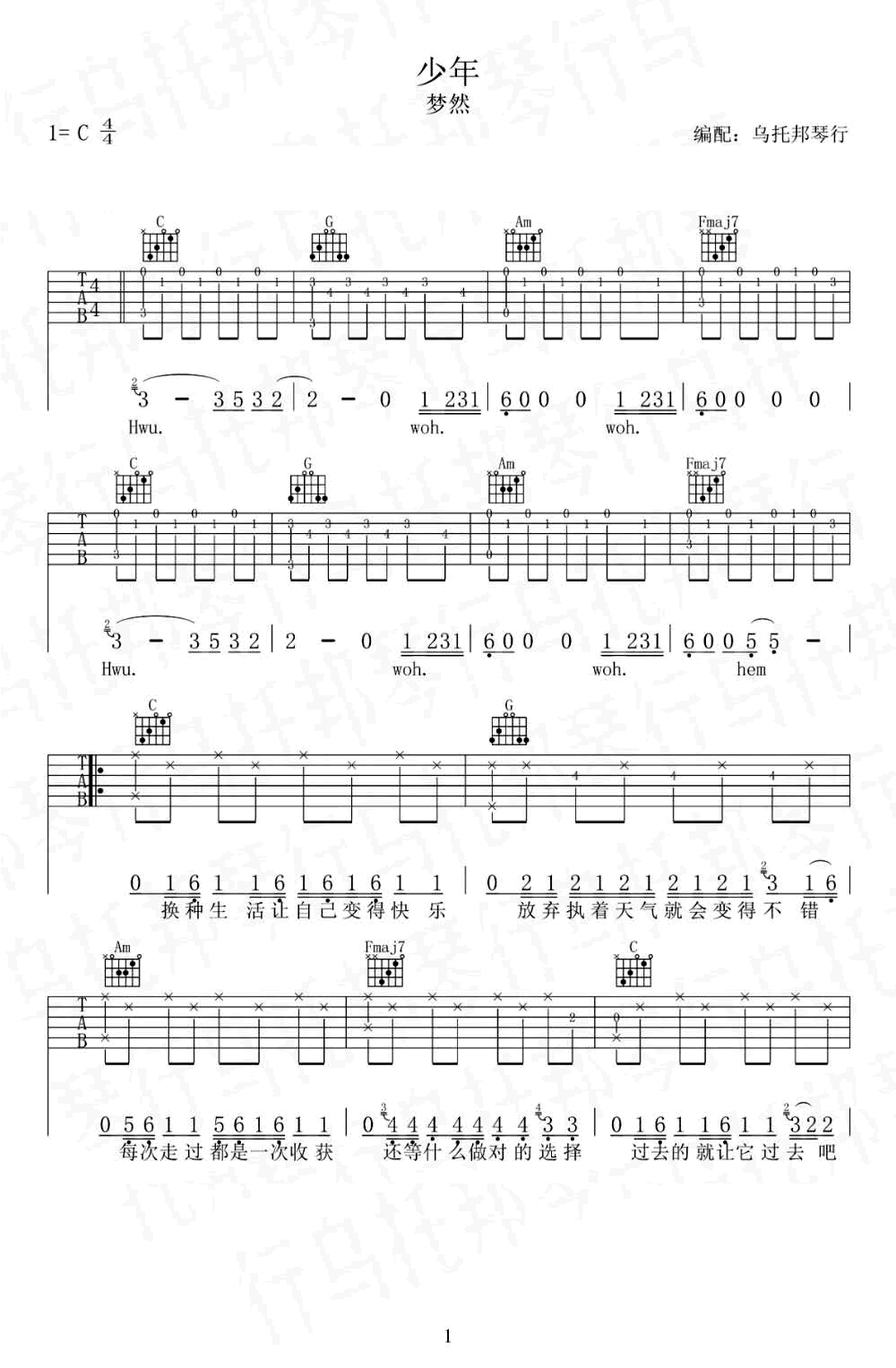 - 少年吉他谱_梦然_C调指法_弹唱六线谱_高清版