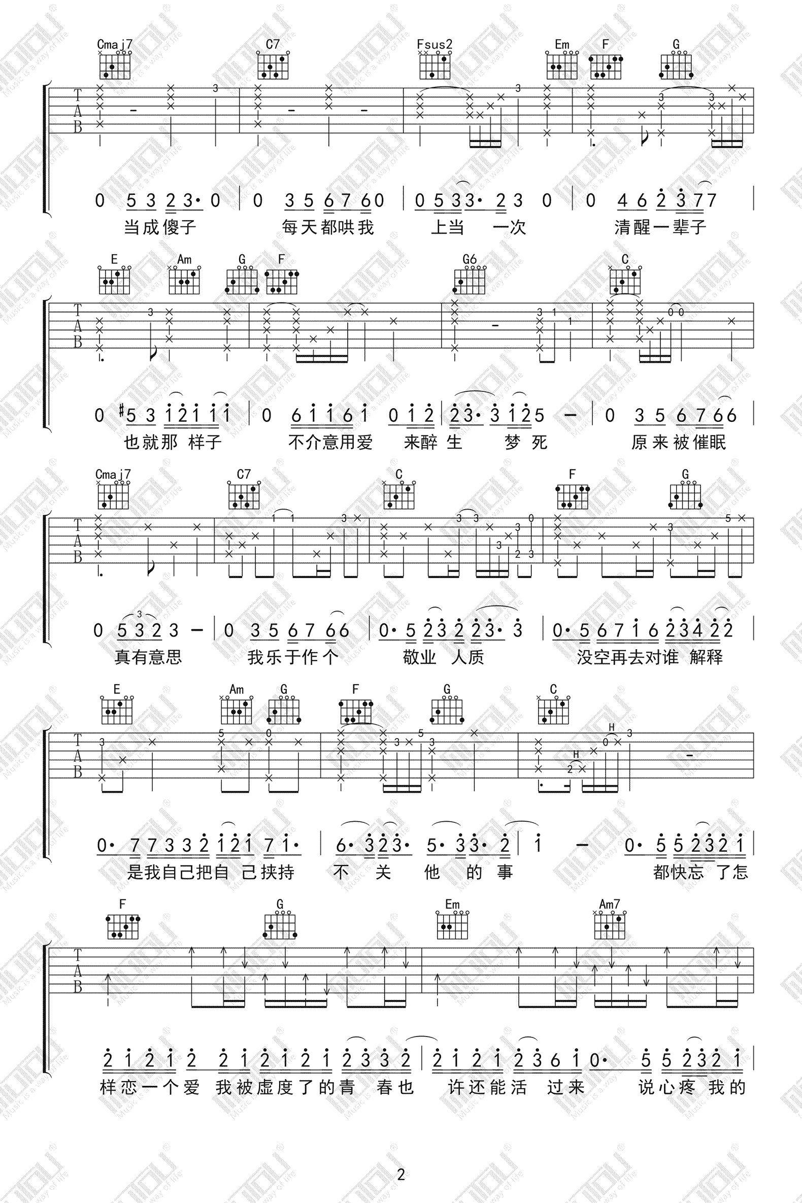 - 与我无关吉他谱_阿冗_C调版本_弹唱六线谱
