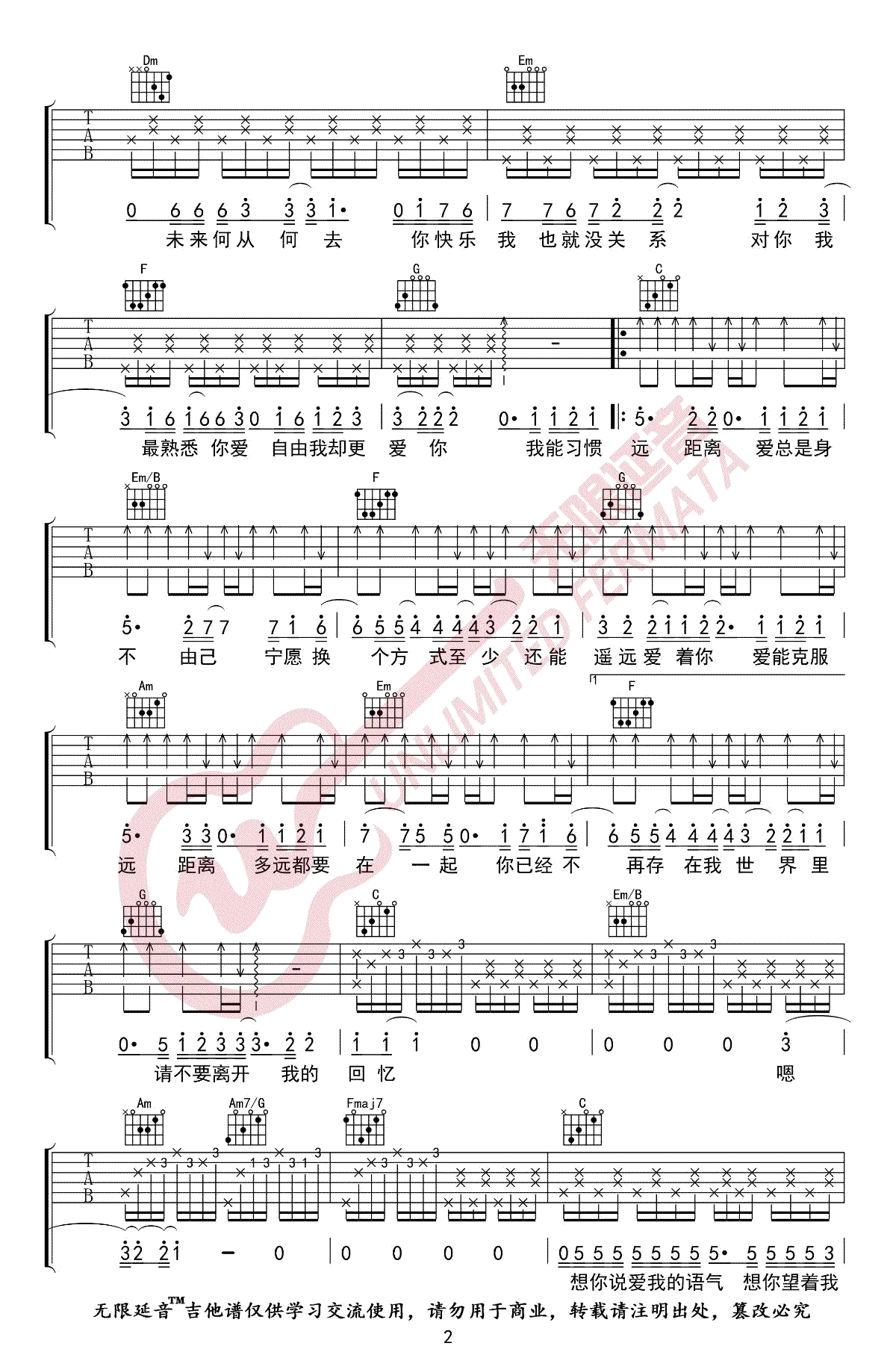 - 与我无关吉他谱_阿冗_C调版本_弹唱六线谱