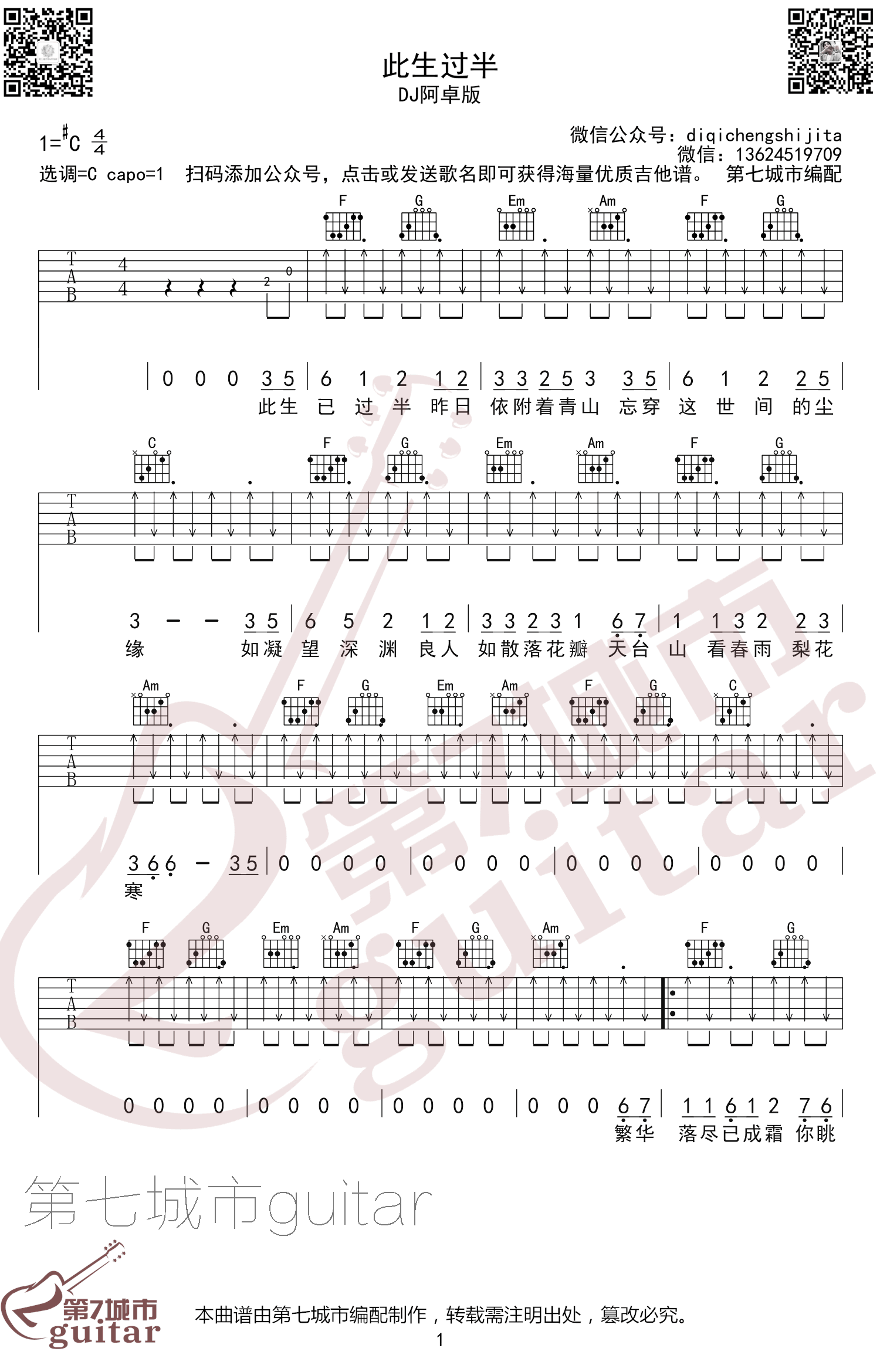 - 此生过半吉他谱_DJ阿卓版_C调弹唱谱_抖音热门BGM